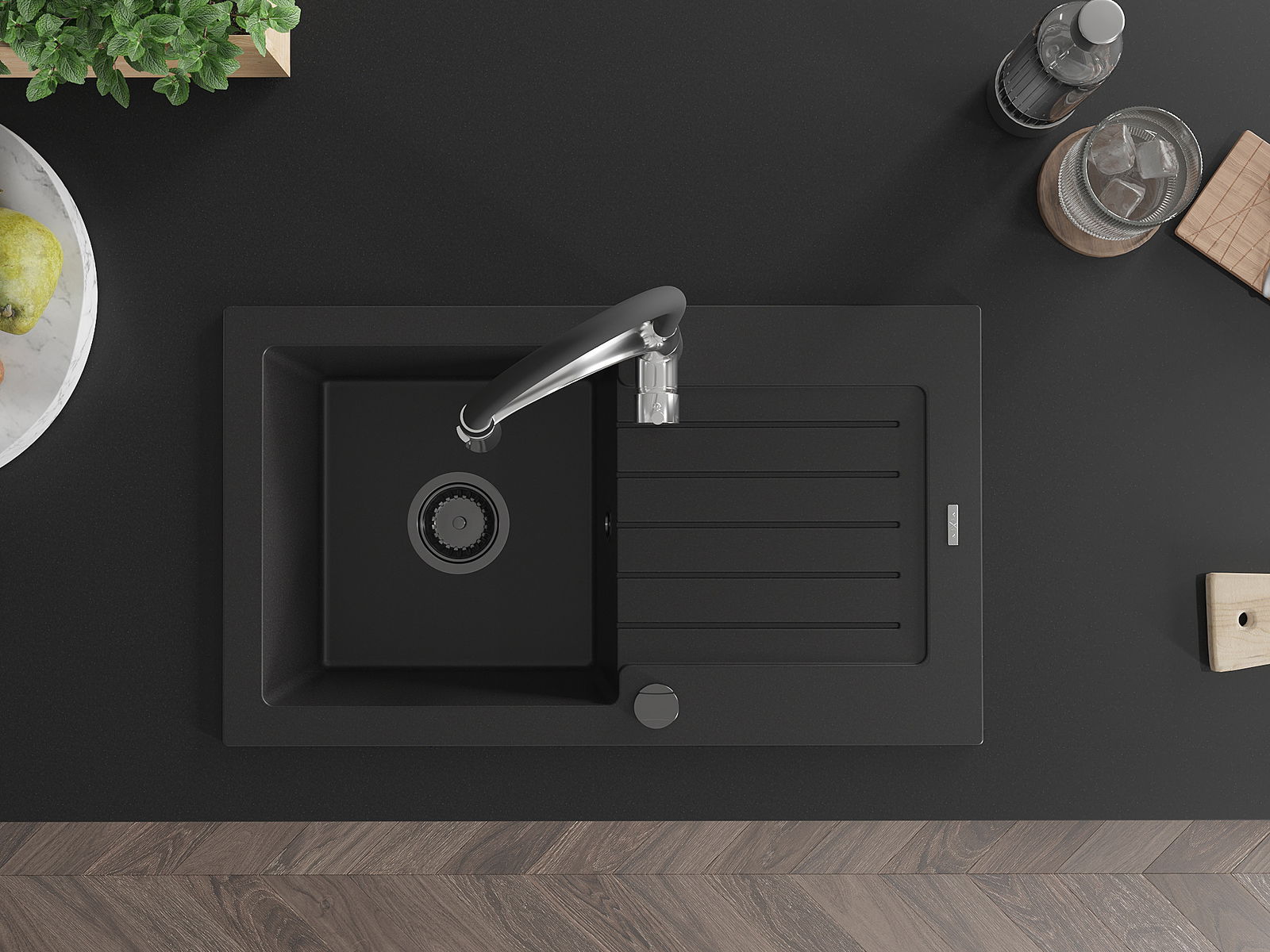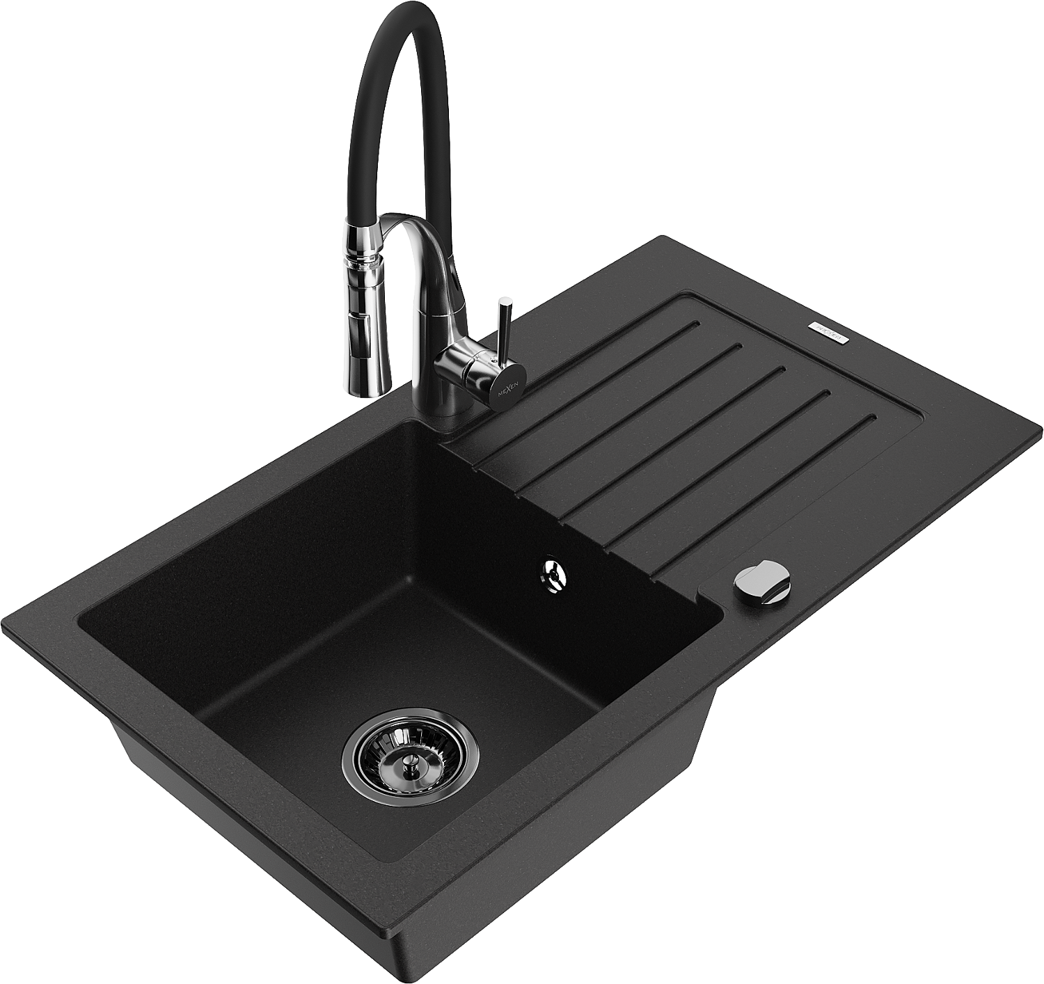 Mexen Pablo granitový drez 1-komorový s odkvapkávačom a kuchynskou batériou Aster, čierny - 6510-77-73450-07-B