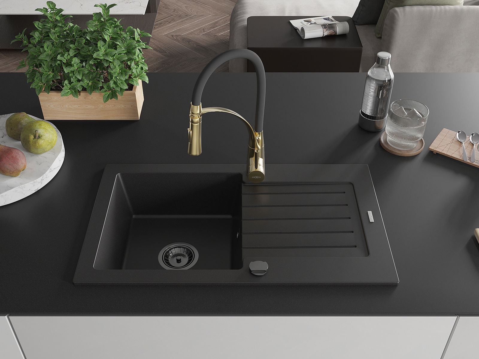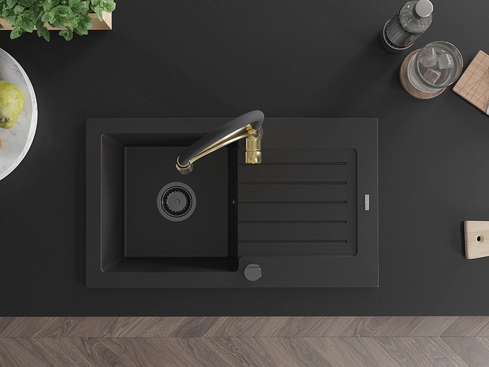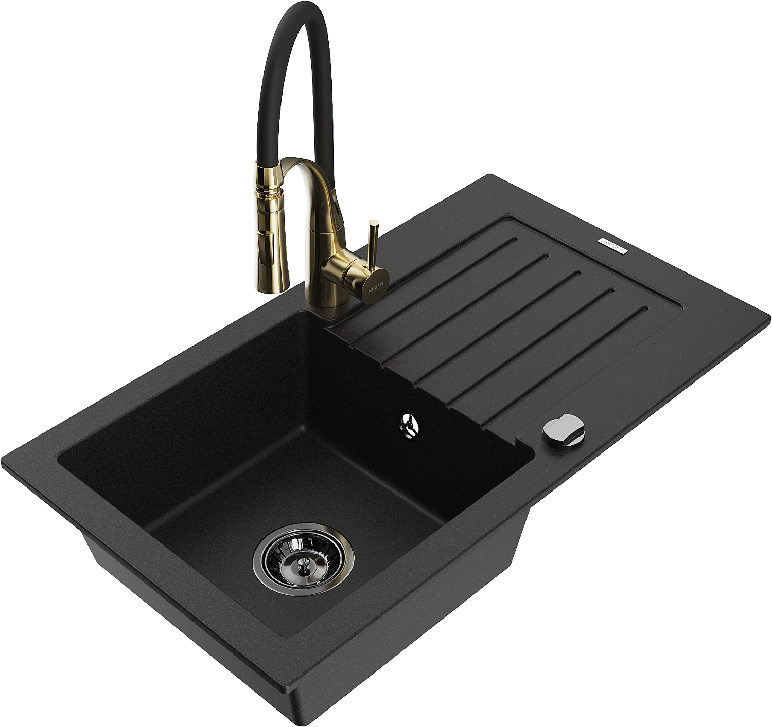 Mexen Pablo granitový drez 1-komorový s odkvapkávačom a kuchynskou batériou Aster, čierny - 6510-77-73450-57-B
