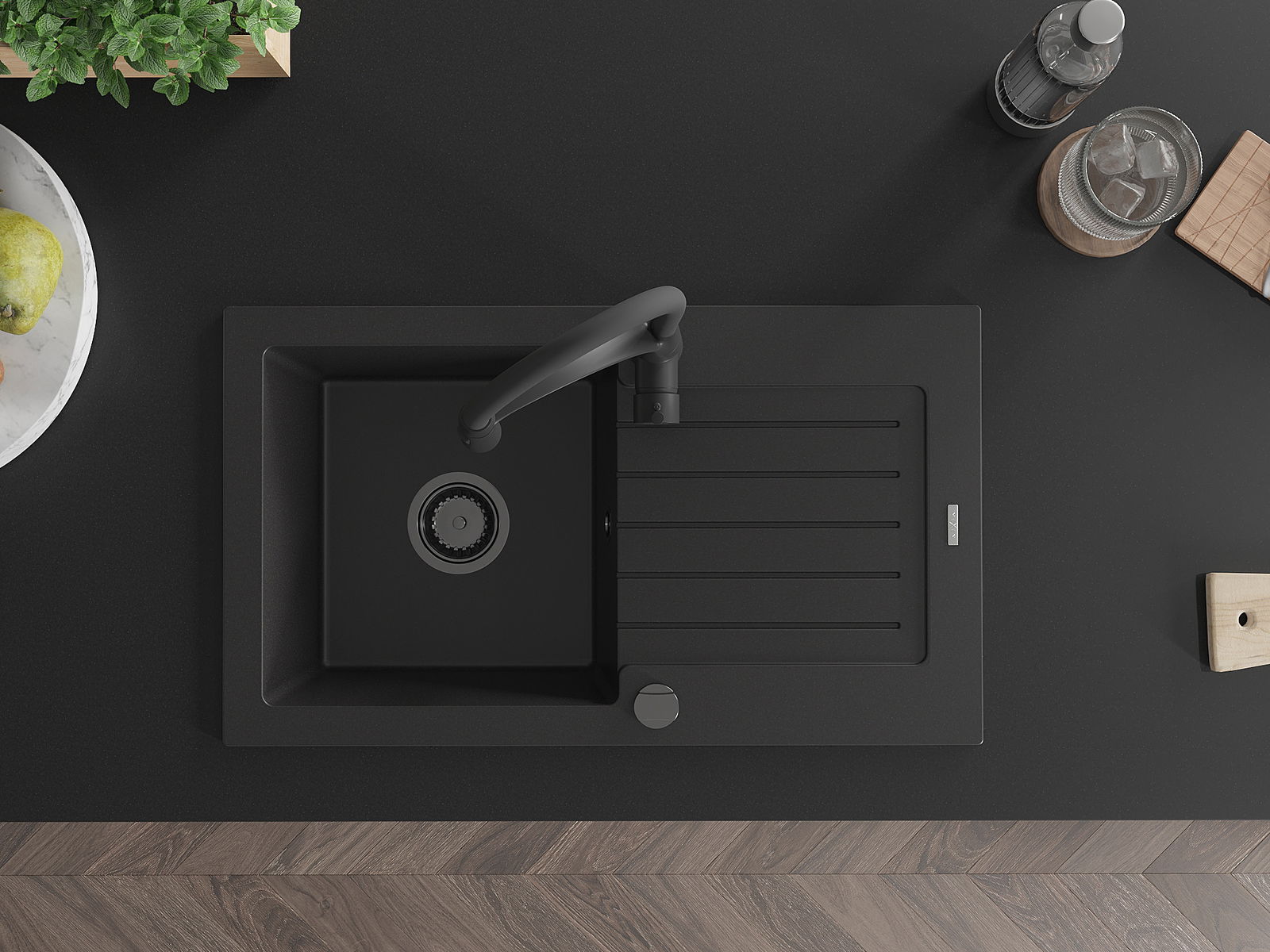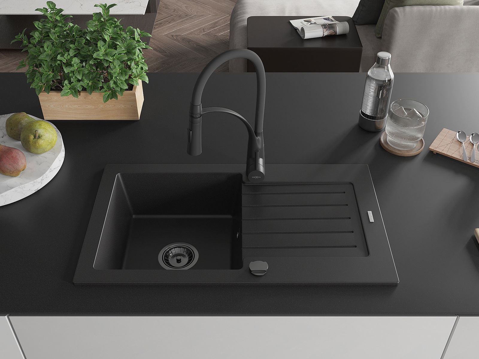 Mexen Pablo granitový kuchynský drez s 1-misou a odkvapkávačom a kuchynskou batériou Aster, čierny - 6510-77-73450-70-B