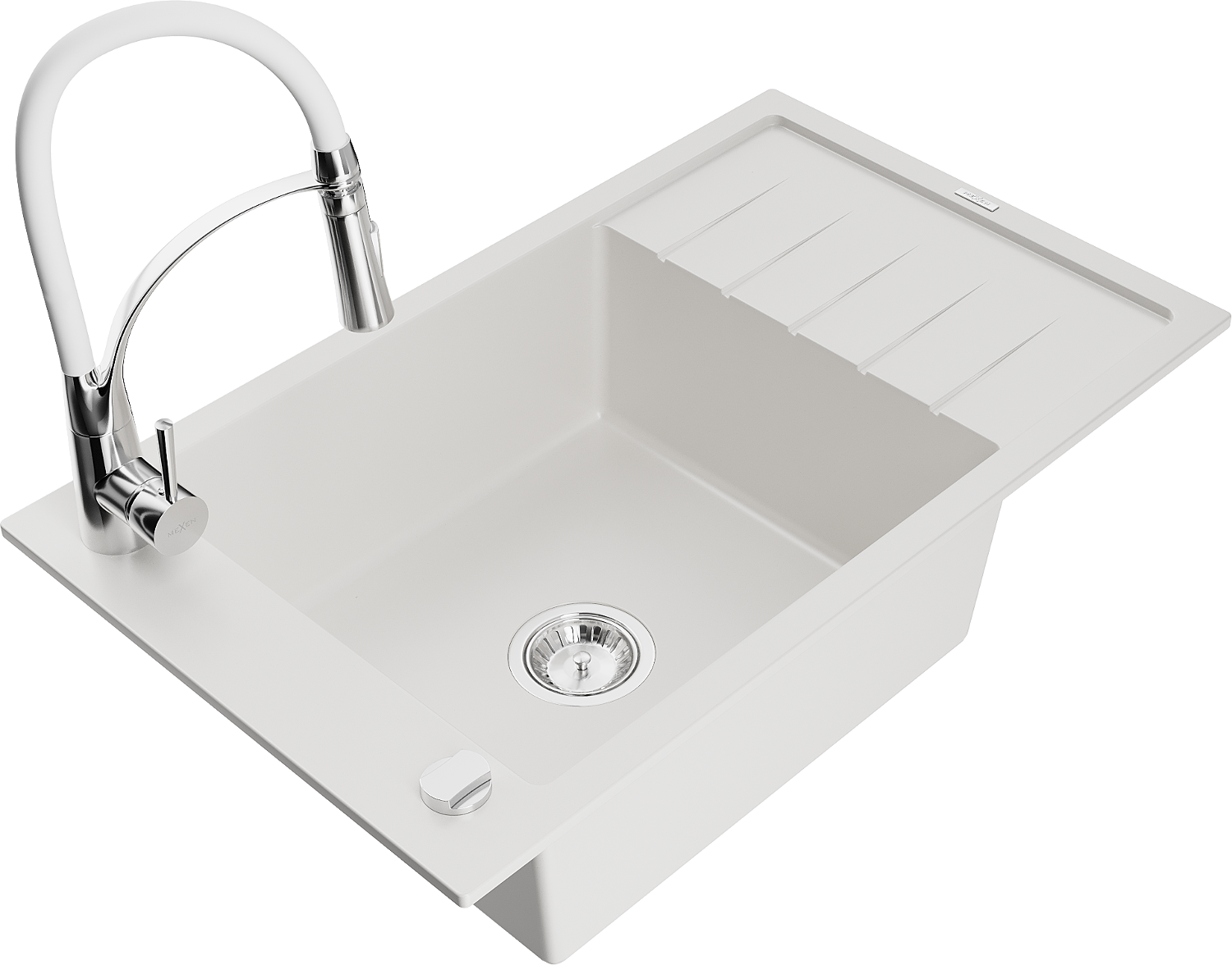 Mexen Elias žulový drez 1-komorový s odkvapkávačom a kuchynskou batériou Aster, biely - 6511-20-73450-02