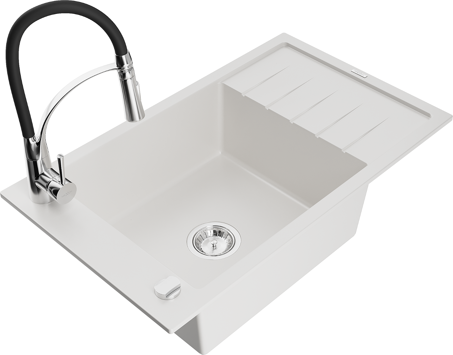 Mexen Elias žulový kuchynský drez 1-komorový s odkvapkávačom a kuchynskou batériou Aster, biely - 6511-20-73450-07