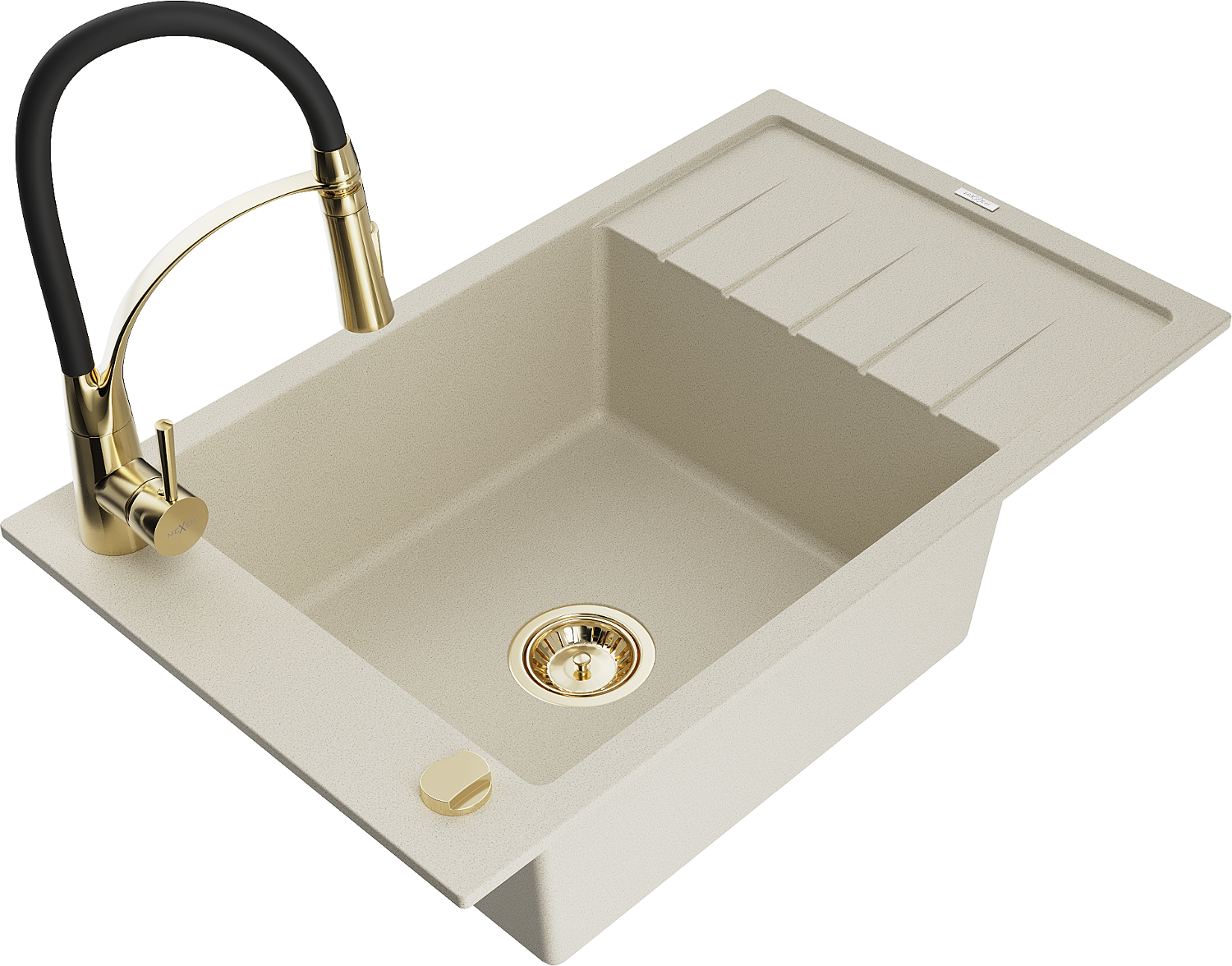 Mexen Elias granitový drez 1-komorový s odkvapkávačom a kuchynskou batériou Aster, béžový - 6511-69-73450-57-G