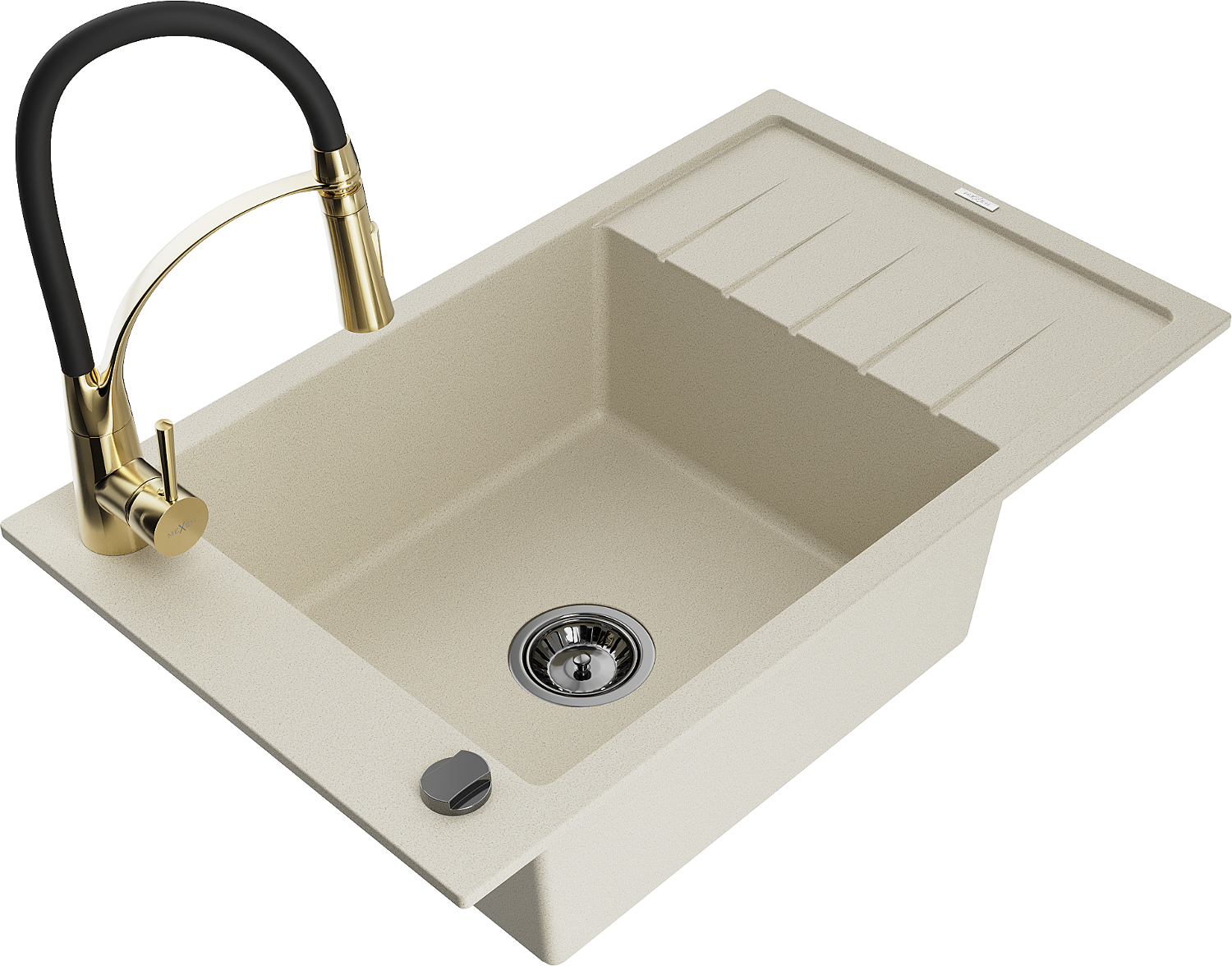 Mexen Elias jednokomorový granitový drez s odkvapkávačom a kuchynskou batériou Aster, béžový - 6511-69-73450-57-B