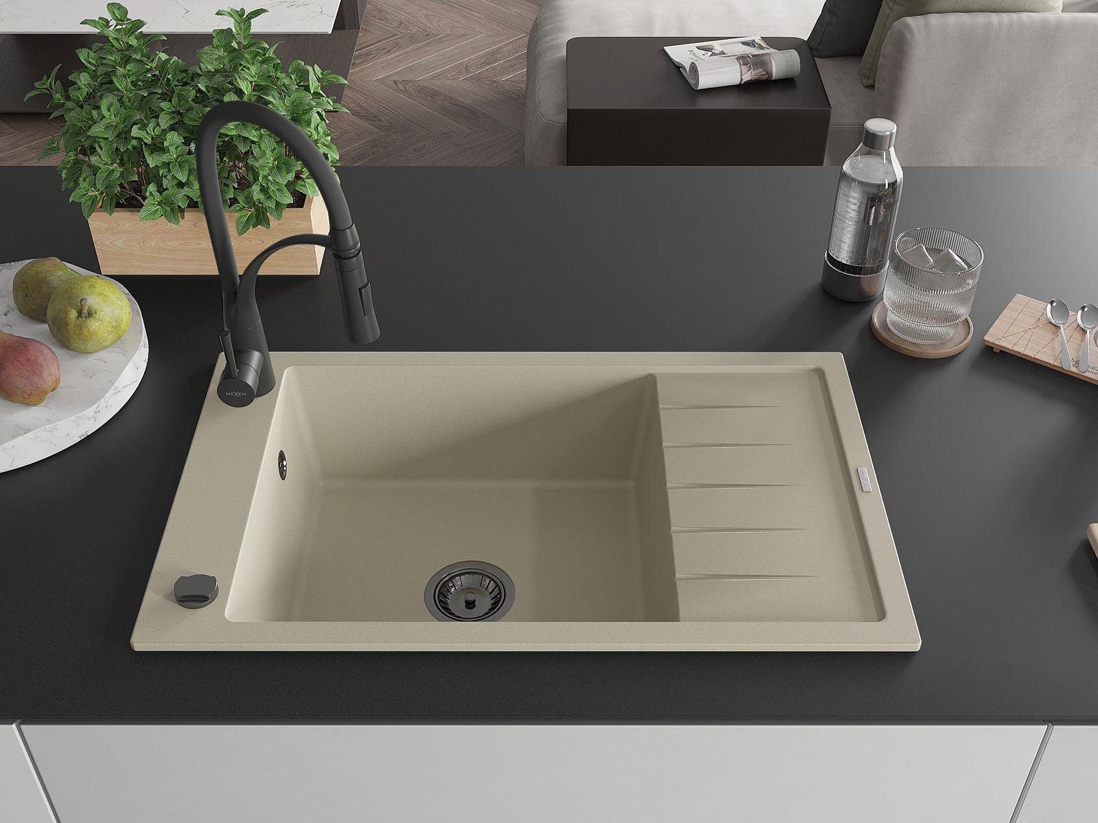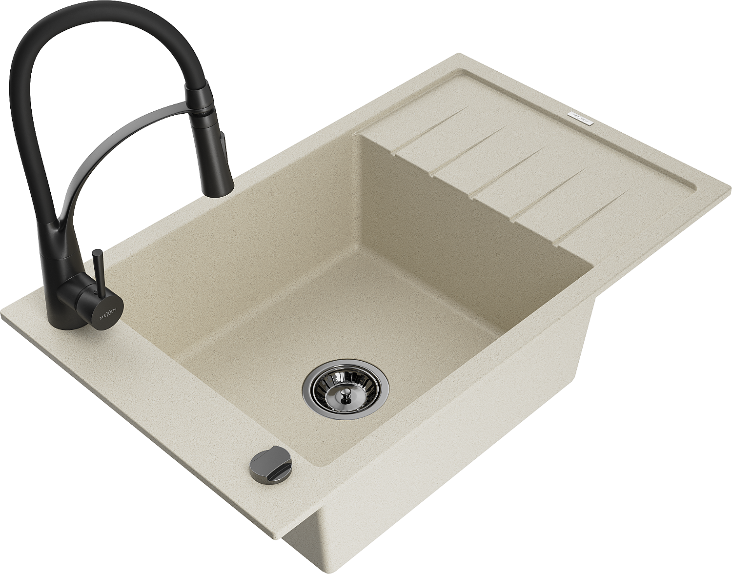 Mexen Elias jednokomorový granitový drez s odkvapkávačom a kuchynskou batériou Aster, béžový - 6511-69-73450-70-B