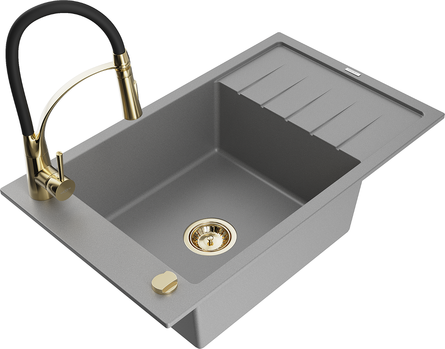 Mexen Elias granitový drez s 1 komorou a odkvapkávačom a kuchynskou batériou Aster, šedý - 6511-71-73450-57-G