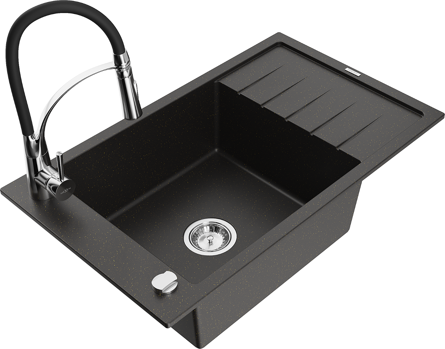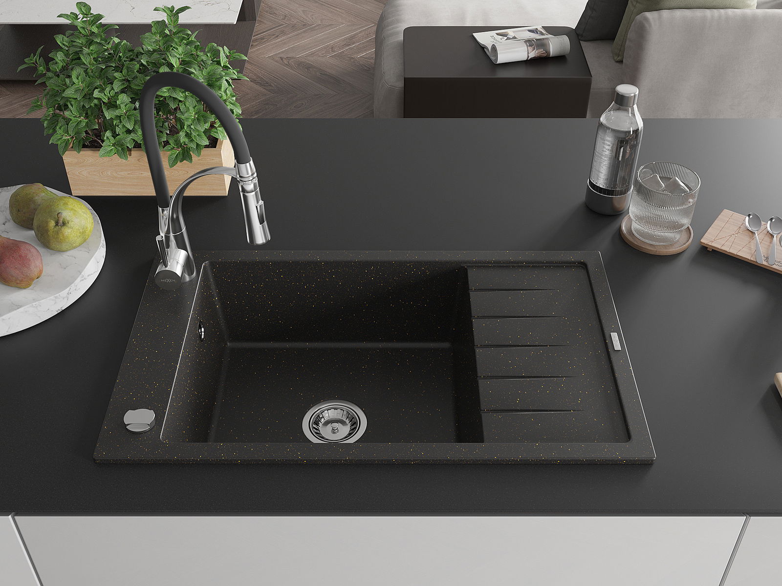 Mexen Elias jednokomorový granitový drez s odkvapkávačom a kuchynskou batériou Aster, čierny/zlatý kovový