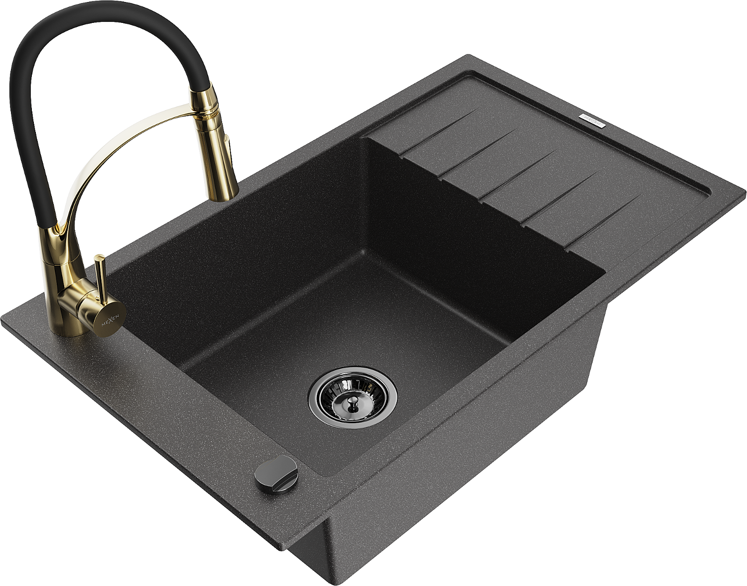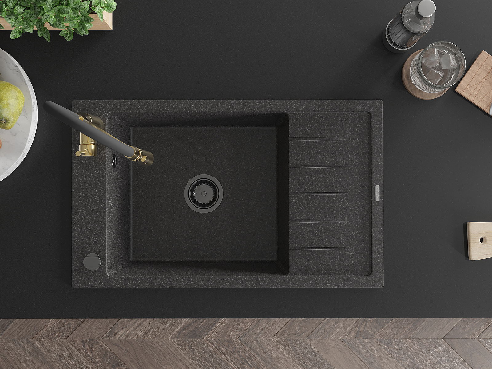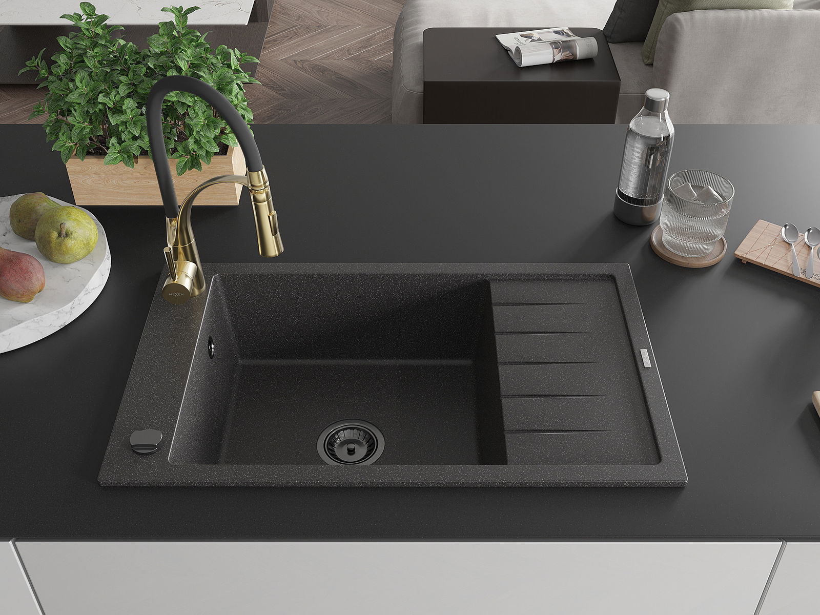 Mexen Elias jednodrezový granitový drez s odkvapkávačom a kuchynskou batériou Aster, čierny s fľakmi - 6511-76-73450-57-B
