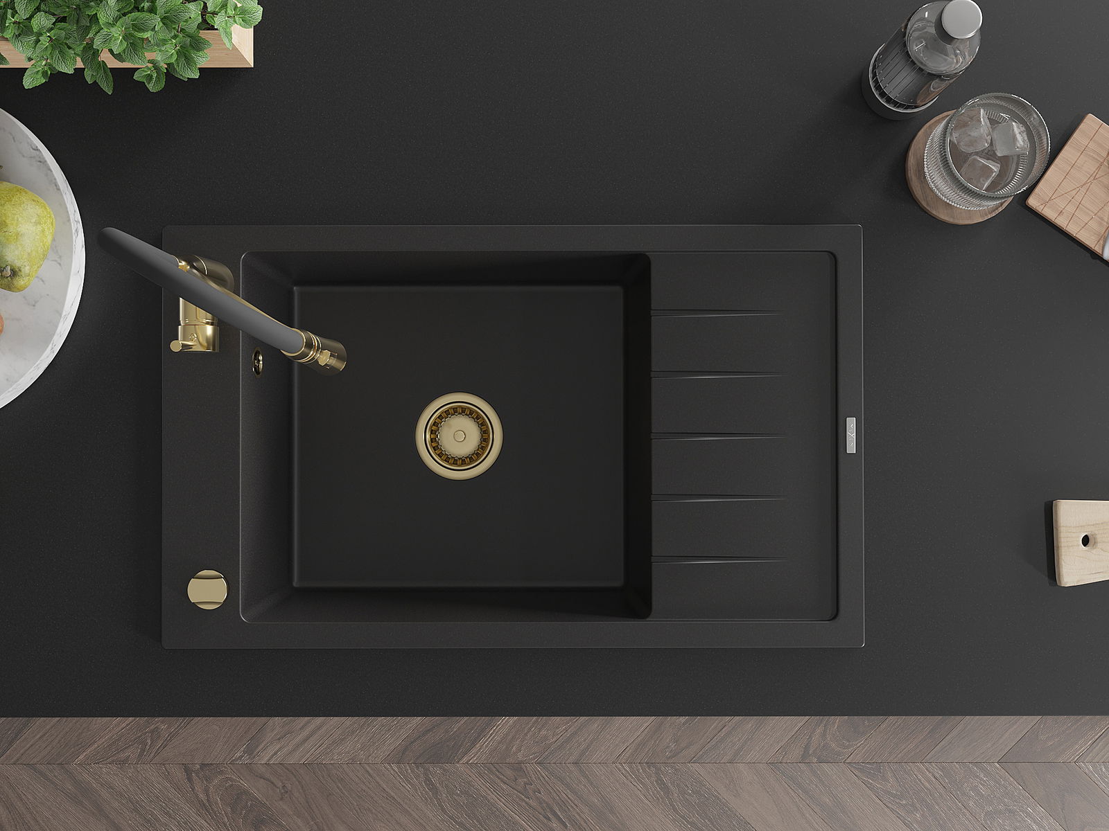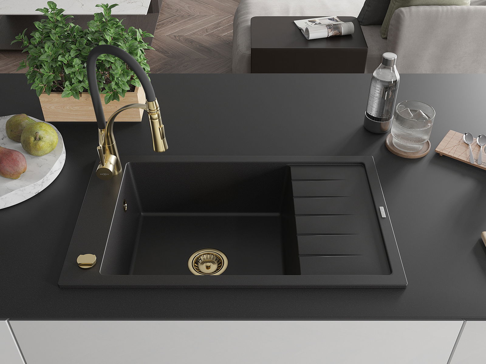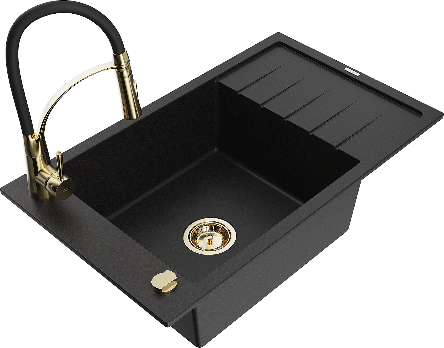Mexen Elias žulový kuchynský drez 1-komorový s odkvapkávacou plochou a kuchynskou batériou Aster, čierny