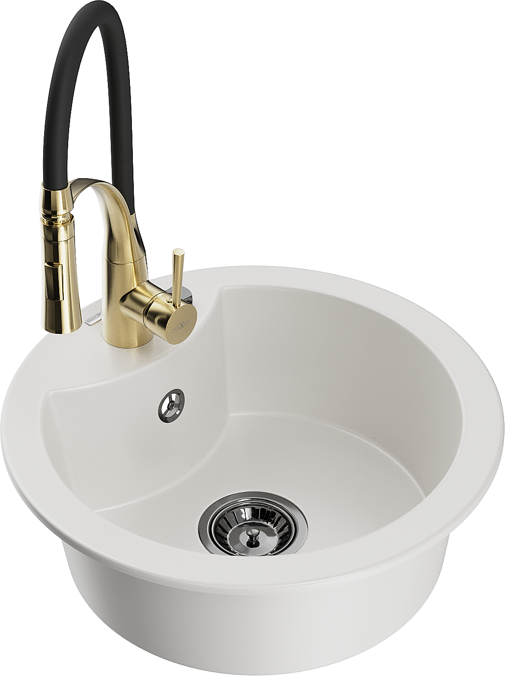 Mexen Diego žulový kuchynský drez s 1 komorou a kuchynskou batériou Aster, biely - 6512-20-73450-57-B