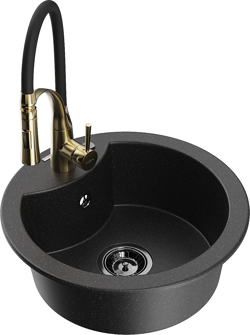 Mexen Diego granitový kuchynský drez s 1 komorou a kuchynskou batériou Aster, čierny/strieborný metalik - 6512-73-73450-57-B