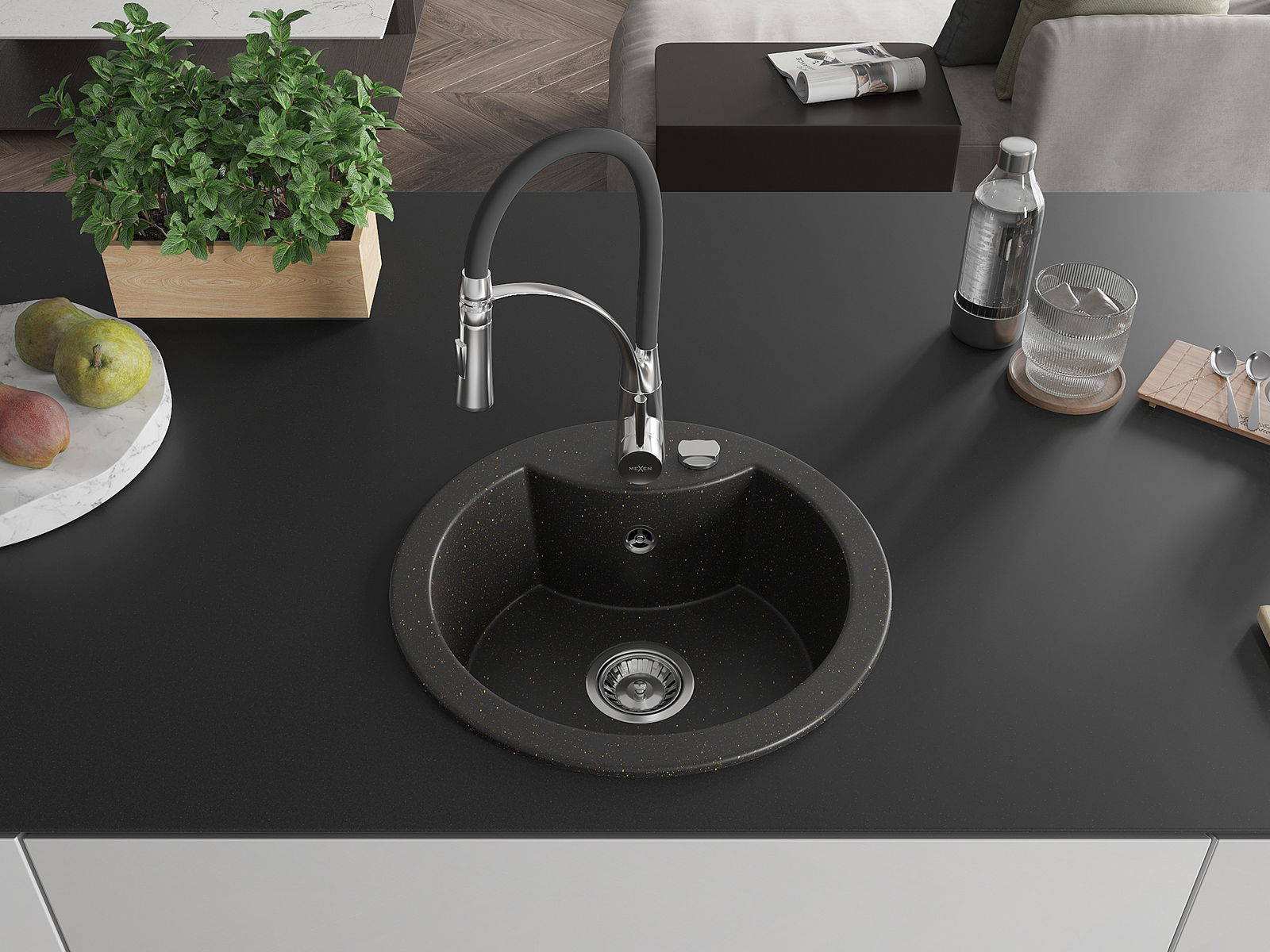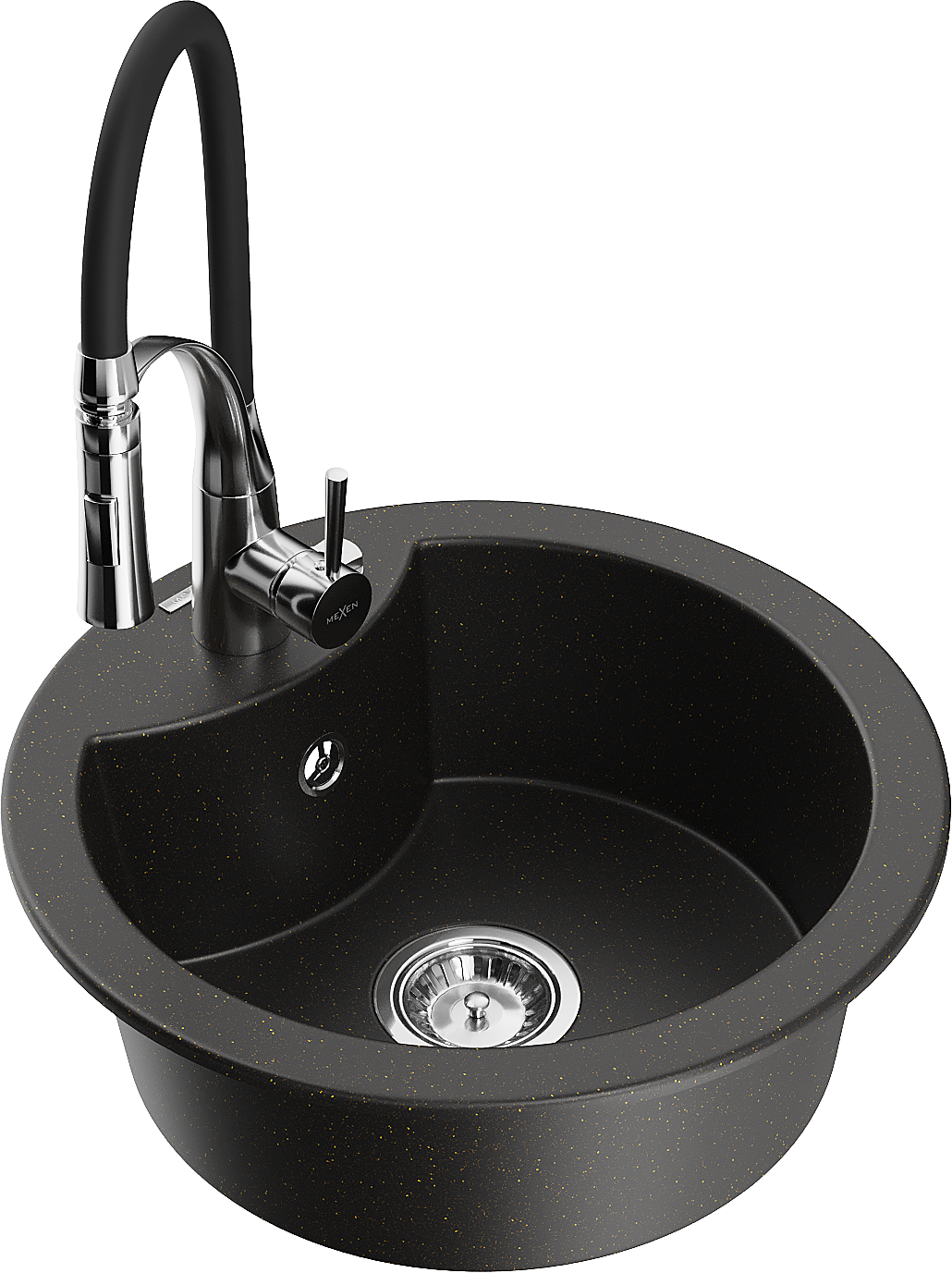 Mexen Diego granitový 1-komorový drez s kuchynskou batériou Aster, čierny/zlatý metalik - 6512-75-73450-70