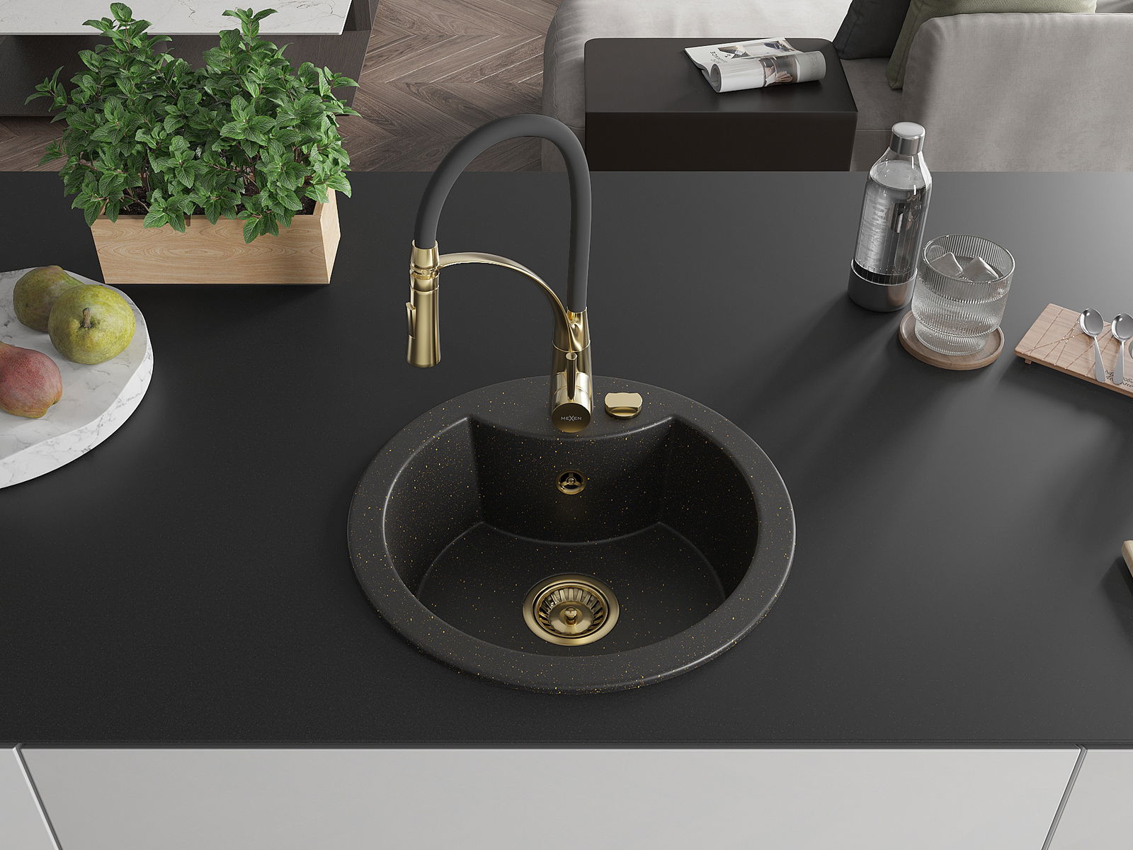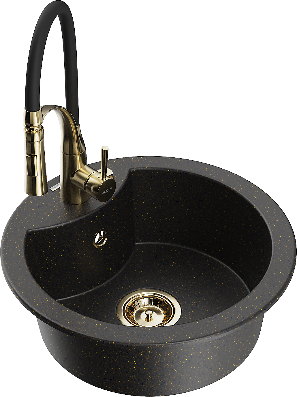 Mexen Diego žulový kuchynský drez 1-komorový s kuchynskou batériou Aster, čierny/zlatý metalický - 6512-75-73450-57-G