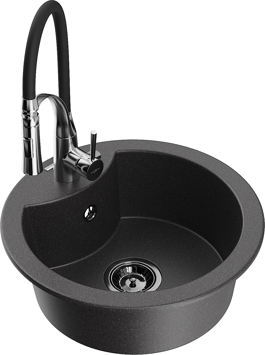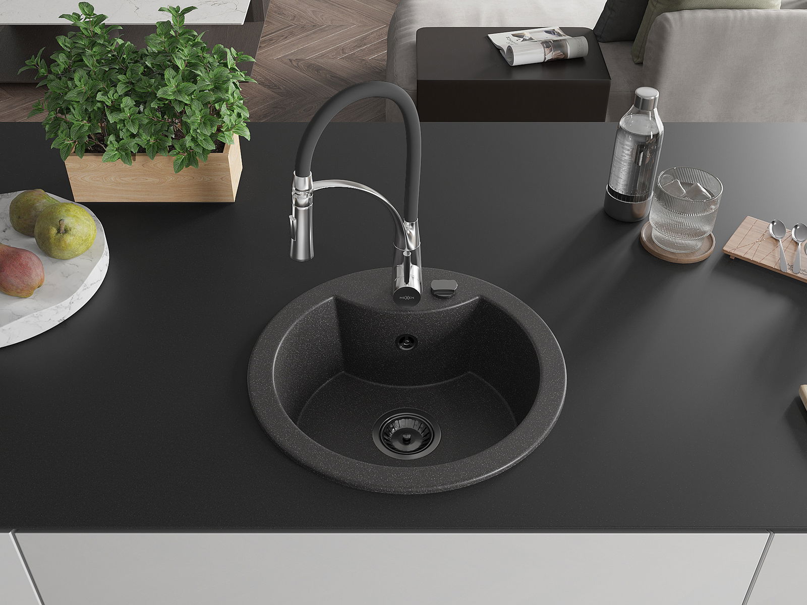 Mexen Diego granitový kuchynský drez 1-komorový s kuchynskou batériou Aster, čierny striekaný - 6512-76-73450-07-B