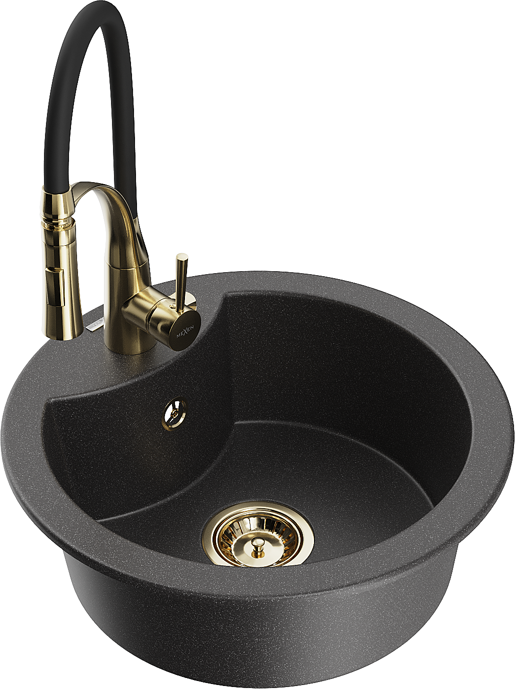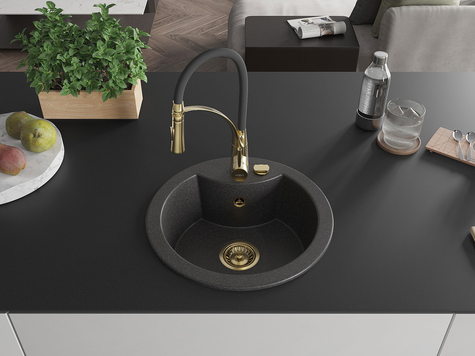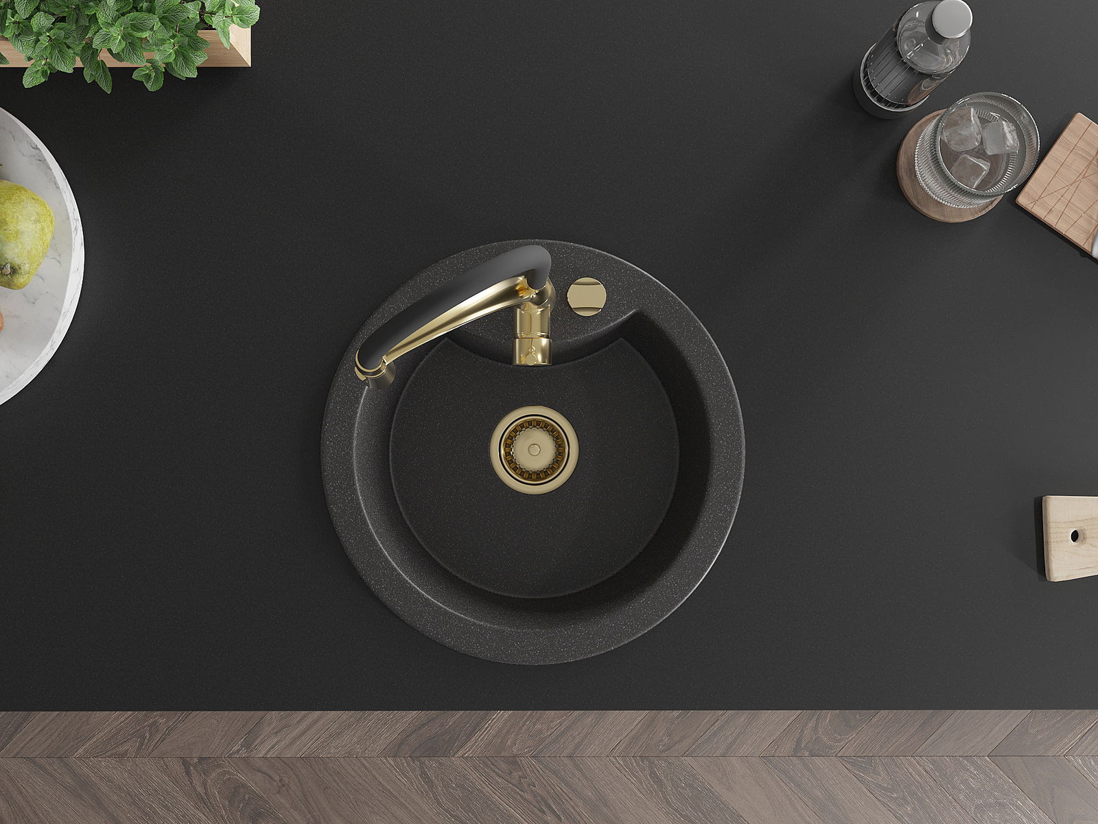 Mexen Diego granitový drez 1-komorový s kuchynskou batériou Aster, čierny bodkovaný - 6512-76-73450-57-G