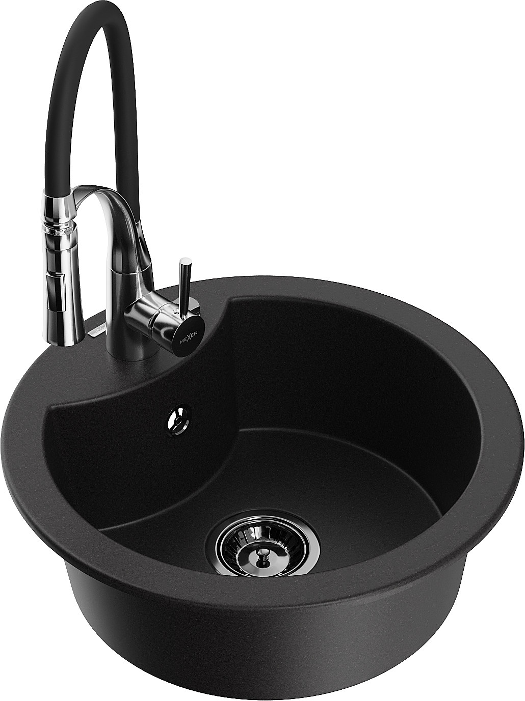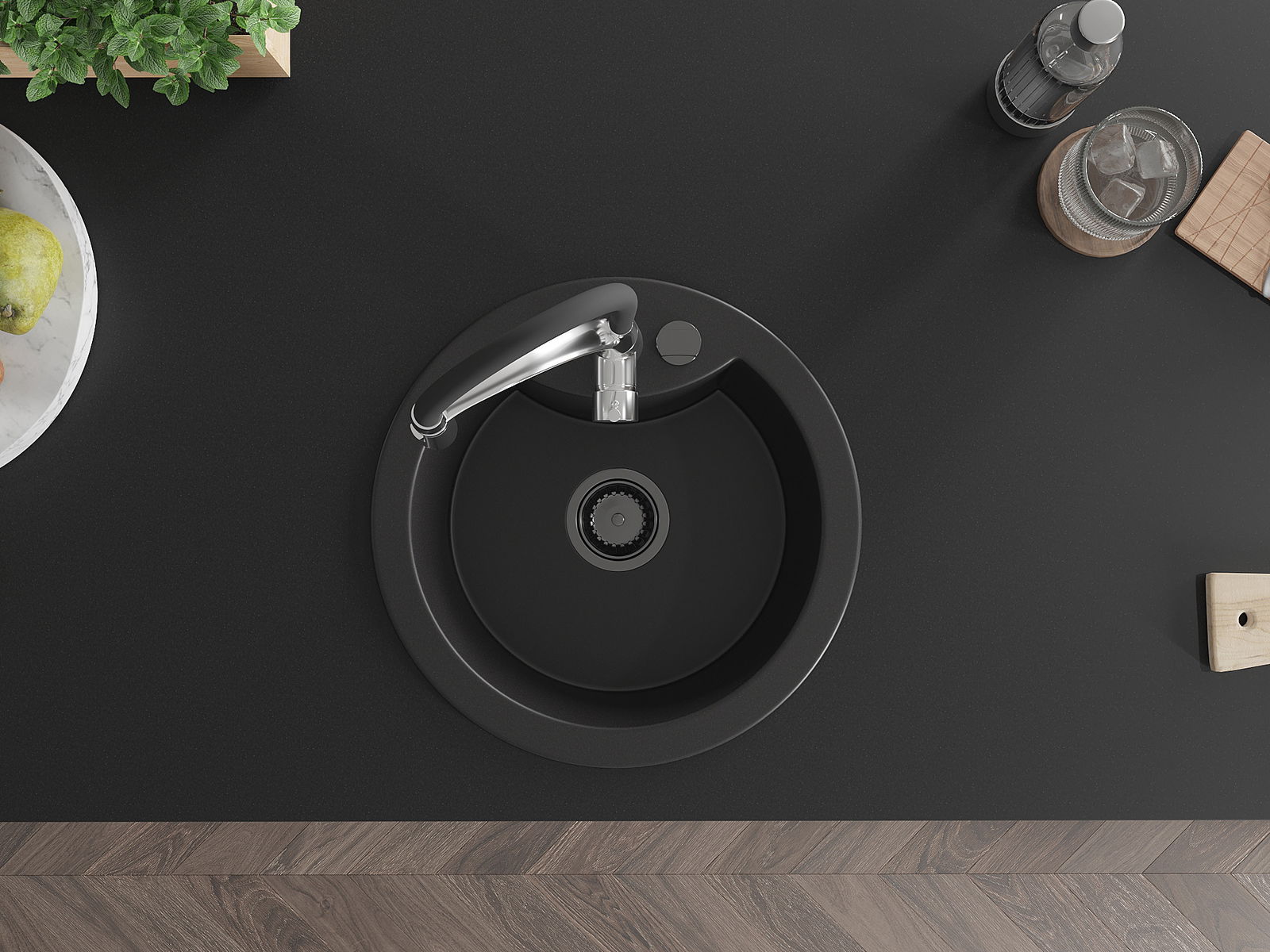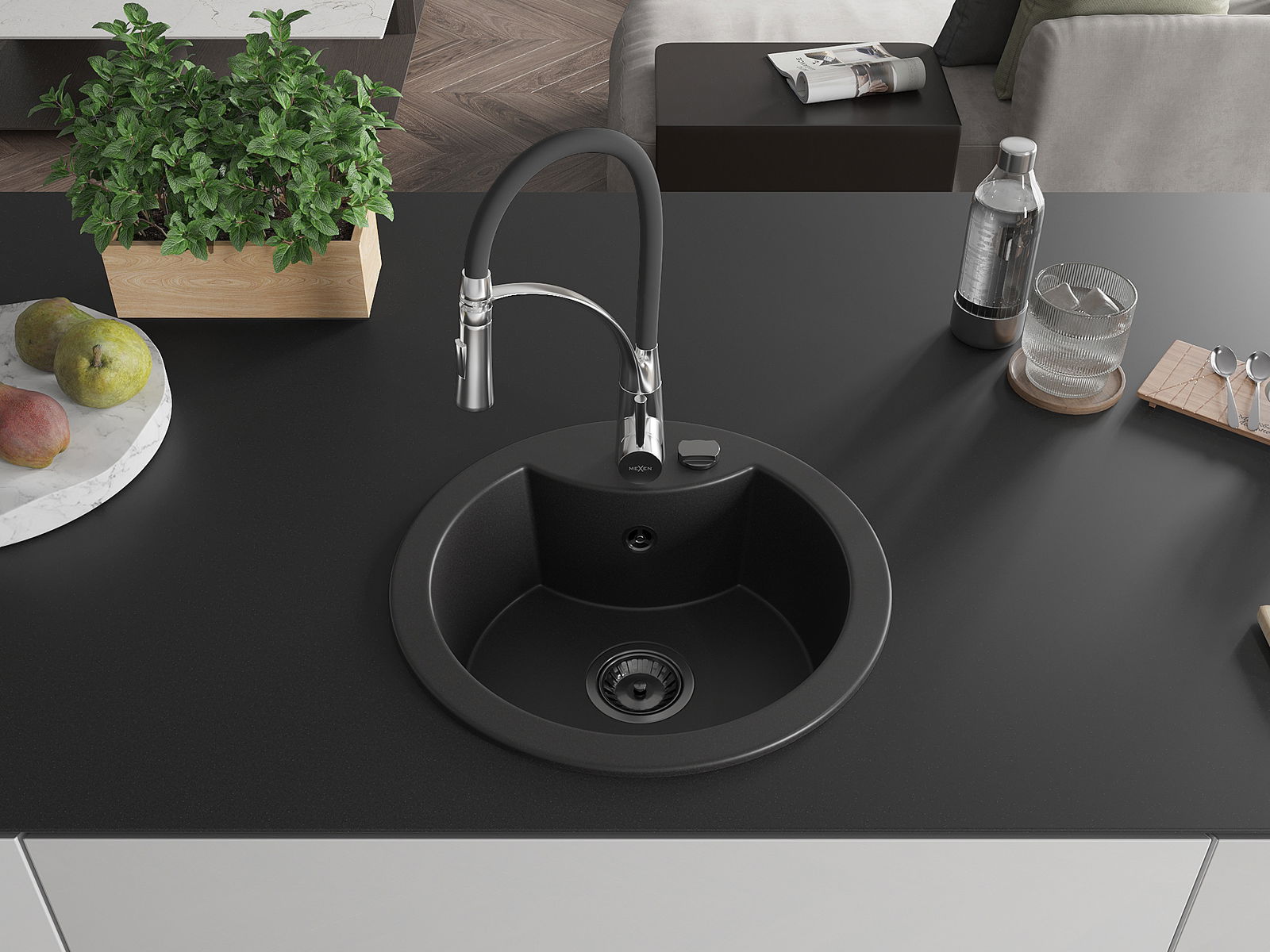 Mexen Diego žulový kuchynský drez 1-komorový s kuchynskou batériou Aster, čierny - 6512-77-73450-07-B