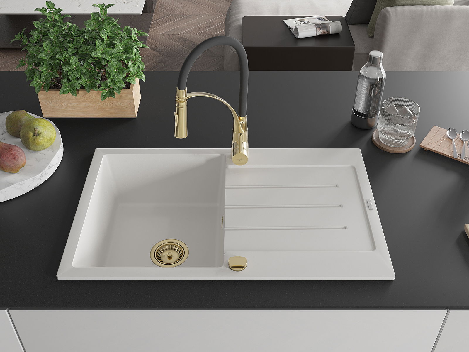 Mexen Bruno granitový kuchynský drez s 1 komorou a odkvapkávačom a kuchynská batéria Aster, biela - 6513-20-73450-57-G