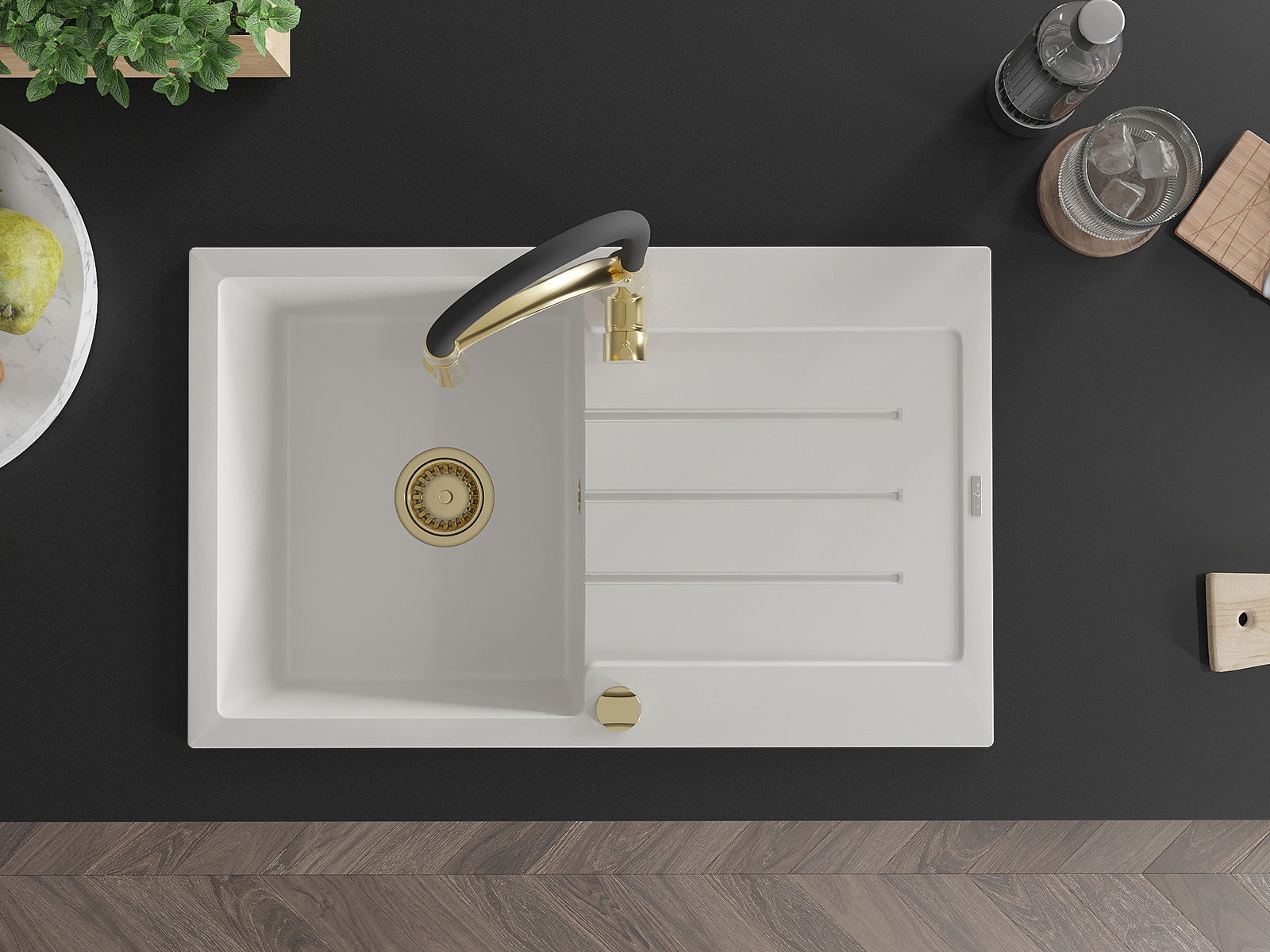 Povrch kuchynského drezu je odolný voči škvrnám a zafarbeniu, vďaka čomu sa ľahko udržiava a zachováva svoju farbu počas dlhého obdobia používania. Estetický a praktický doplnok pre každú kuchyňu.