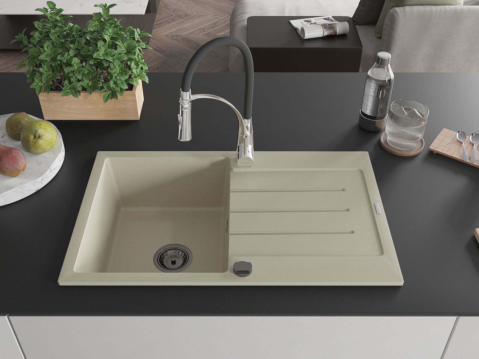 Povrch kuchynského drezu je odolný voči škvrnám a zafarbeniu, vďaka čomu sa ľahko udržiava a zachováva svoju farbu počas dlhého obdobia používania. Estetický a praktický doplnok pre každú kuchyňu.