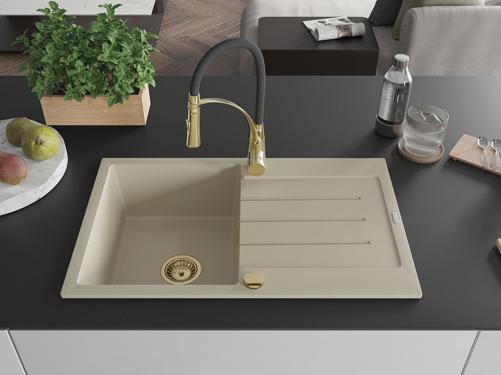 Mexen Bruno žulový kuchynský drez s 1 komorou, odkvapkávačom a kuchynskou batériou Aster, béžový - 6513-69-73450-57-G
