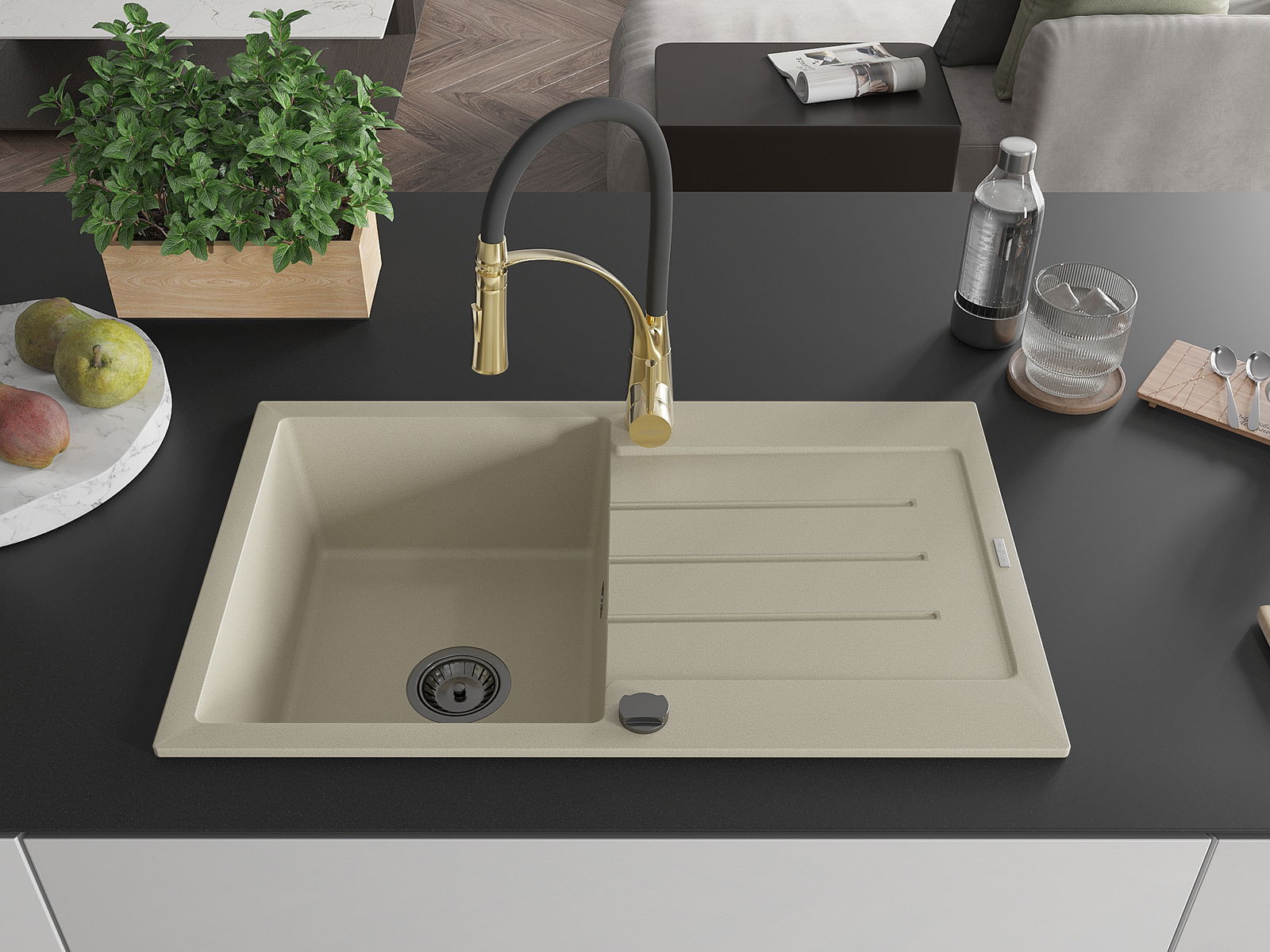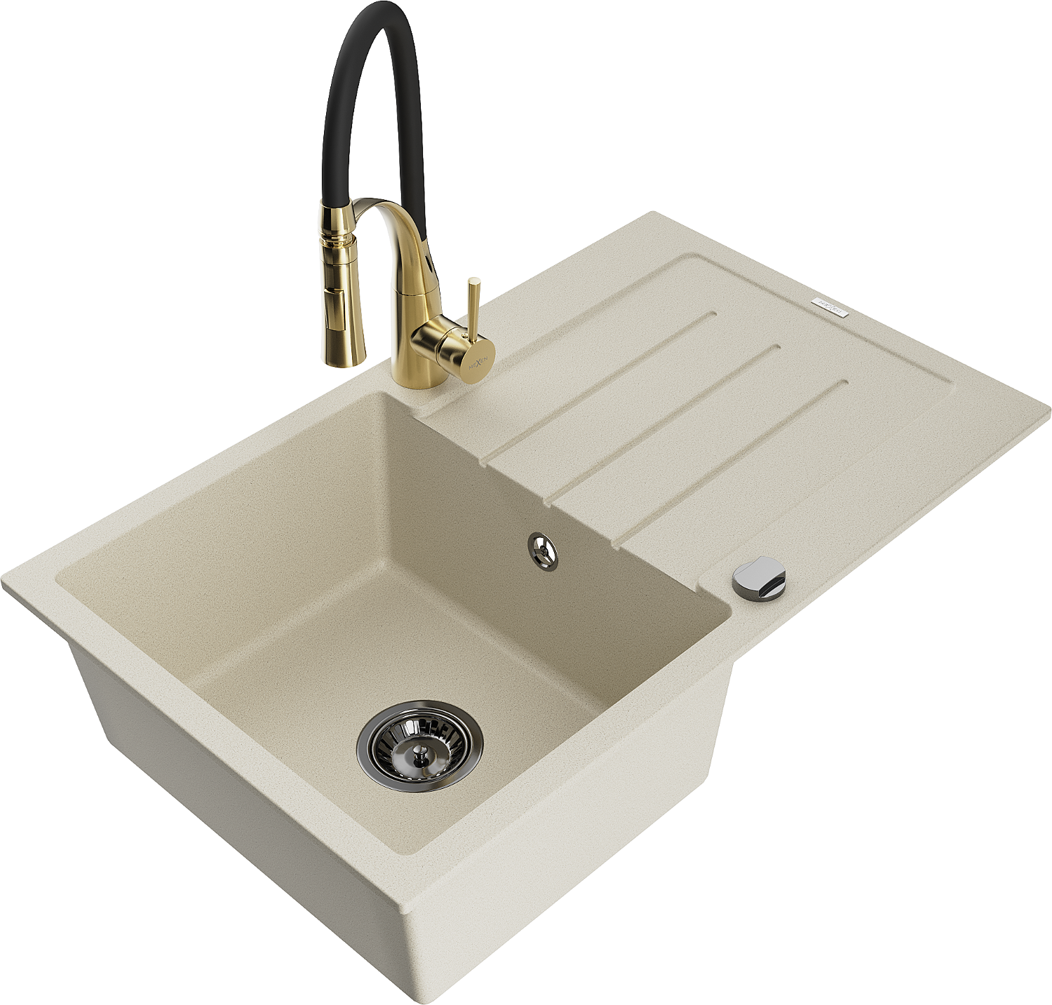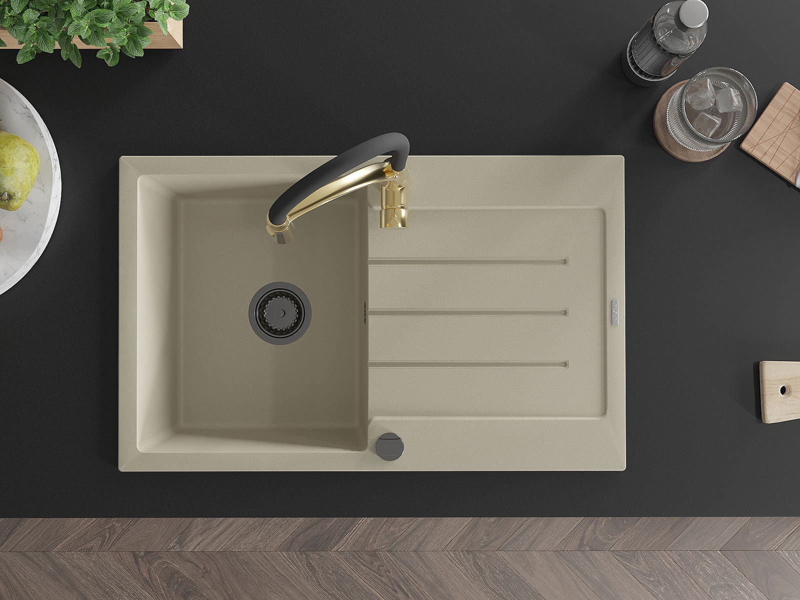 Mexen Bruno žulový drez s 1 komorou a odkvapkávacou plochou a kuchynskou batériou Aster, béžový - 6513-69-73450-57-B