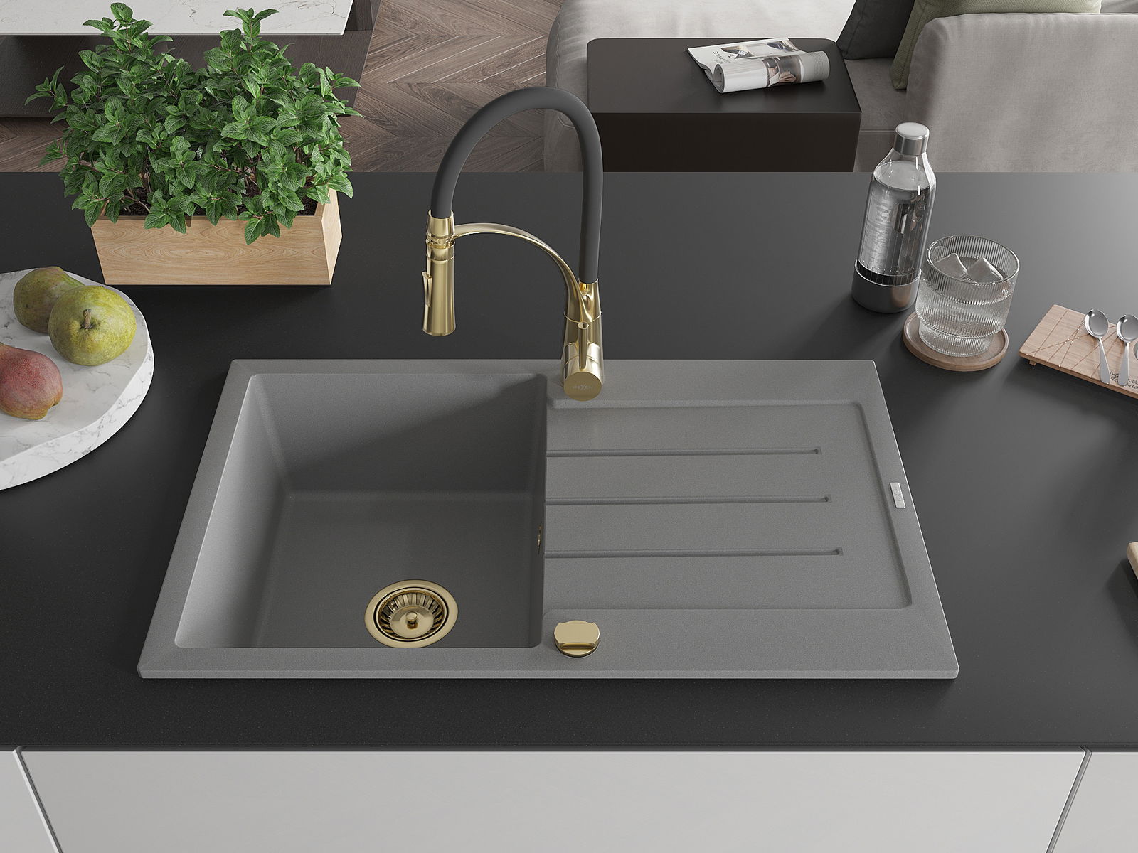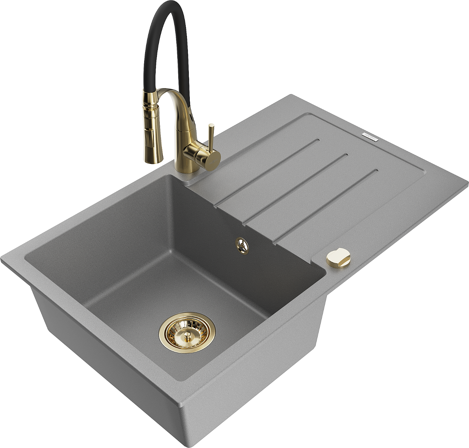 Mexen Bruno žulový drez 1-komorový s odkvapkávacou plochou a kuchynskou batériou Aster, sivý - 6513-71-73450-57-G