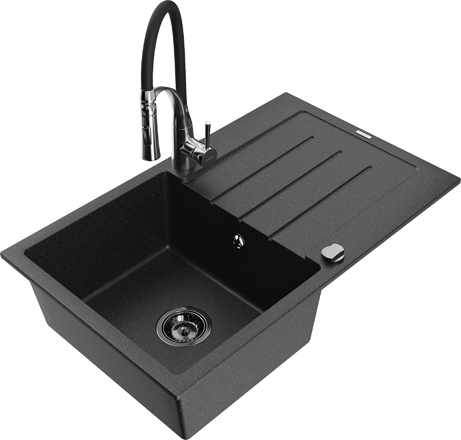 Mexen Bruno kuchynský drez s odkvapkávačom a kuchynská batéria Aster, čierna/strieborný metalický - 6513-73-73450-07-B