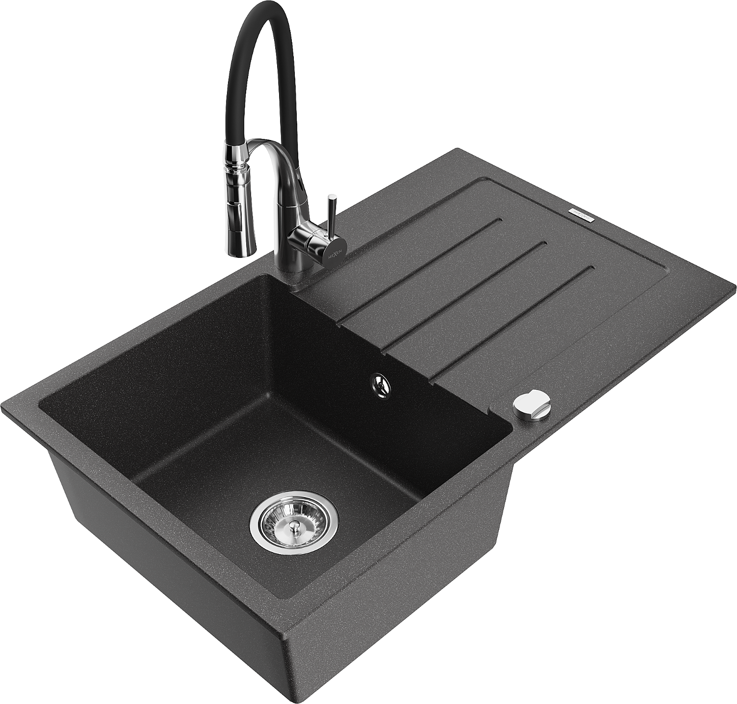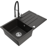 Mexen Bruno granitový kuchynský drez s 1 komorou, odkvapkávacom a kuchynskou batériou Aster, čierny bodkovaný