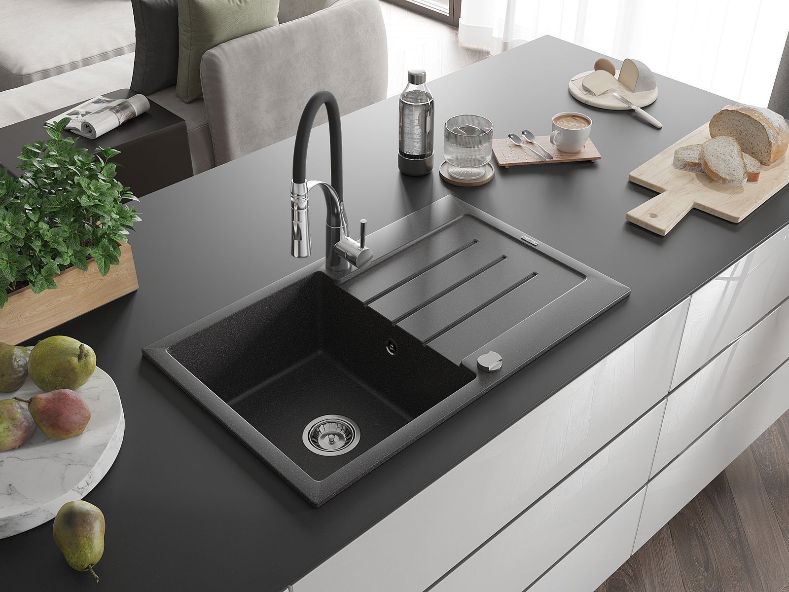 Drez bol vyrobený z vysoko kvalitného granitu. Predstavuje elegantné, ale predovšetkým praktické doplnenie každej kuchyne, nezávisle od jej štýlu. Vysoká kvalita a trvácnosť granitu zaisťujú dlhodobé používanie.