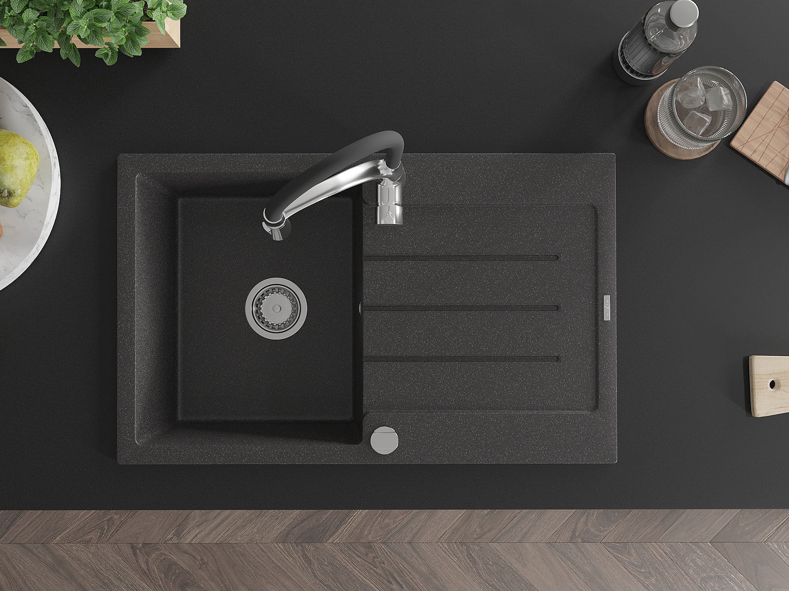Povrch kuchynského drezu je odolný voči škvrnám a zafarbeniu, vďaka čomu sa ľahko udržiava a zachováva svoju farbu počas dlhého obdobia používania. Estetický a praktický doplnok pre každú kuchyňu.