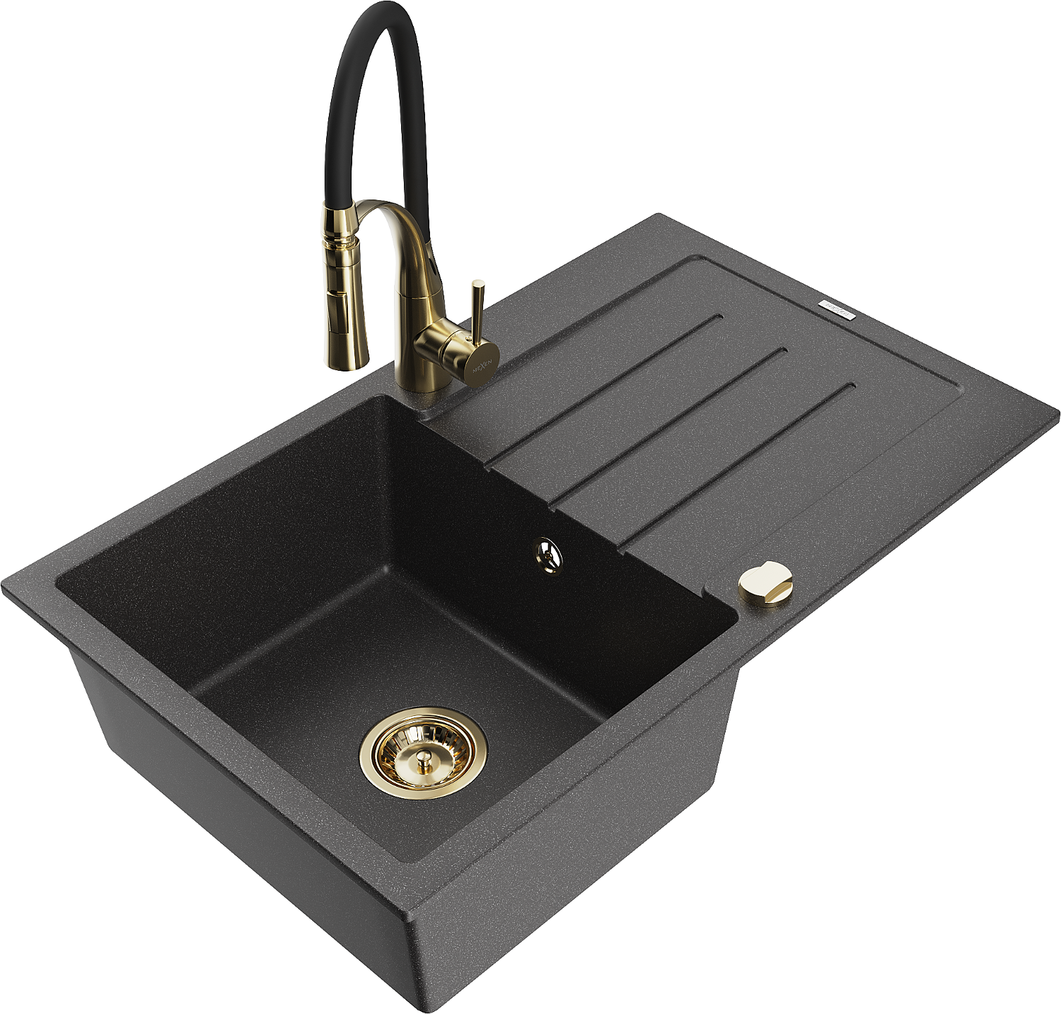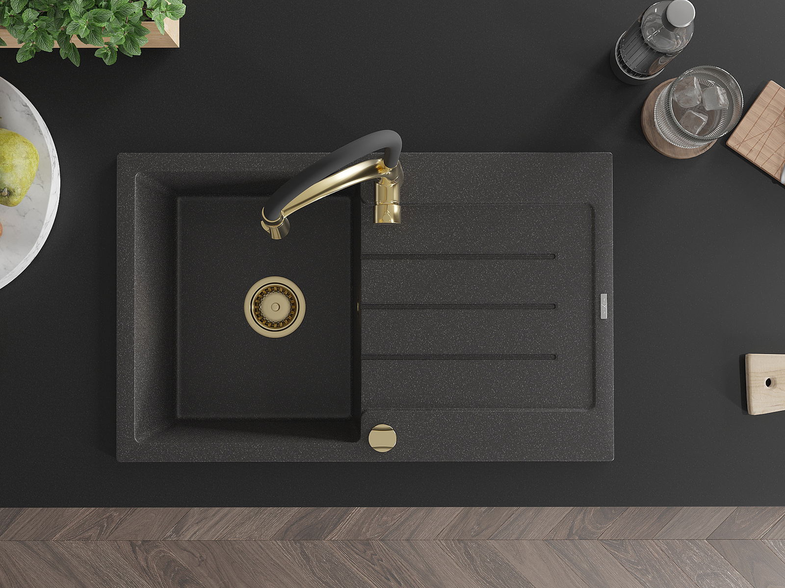 Mexen Bruno granitový drez s jednou komorou, s odkvapkávačom a kuchynskou batériou Aster, čierny s bodkami
