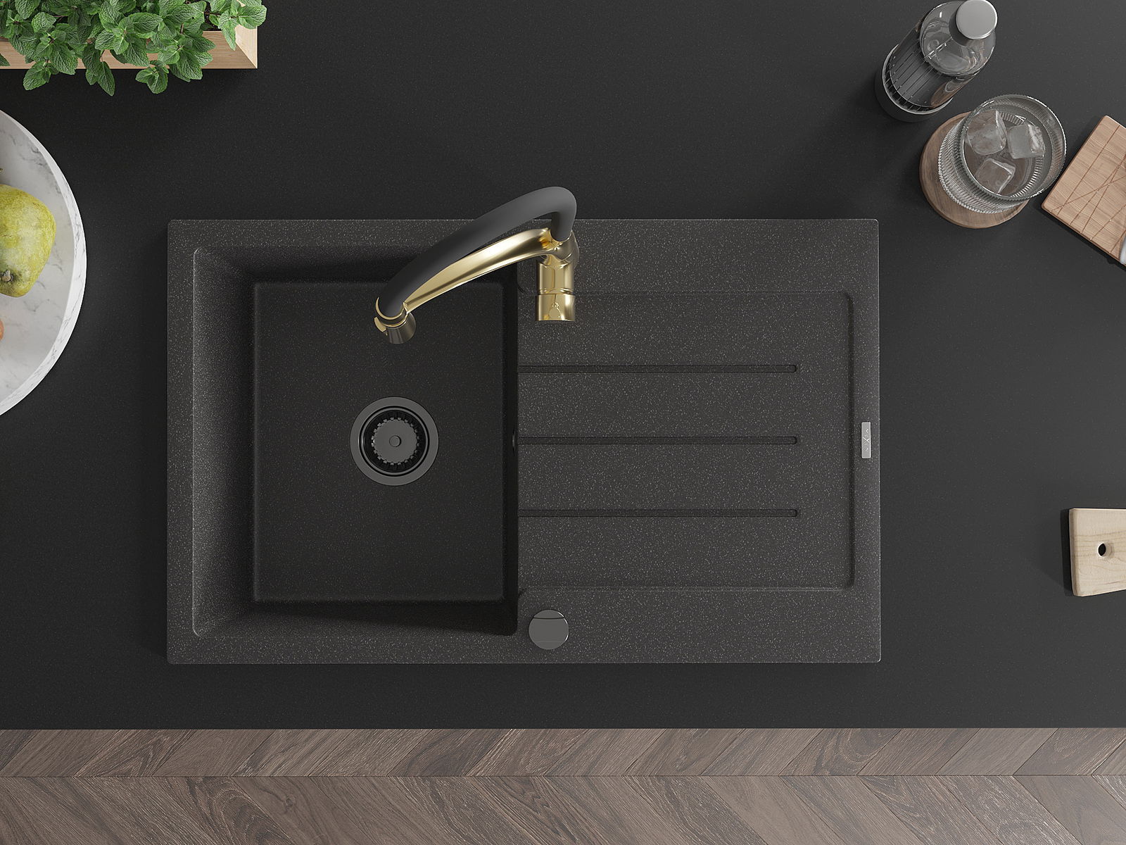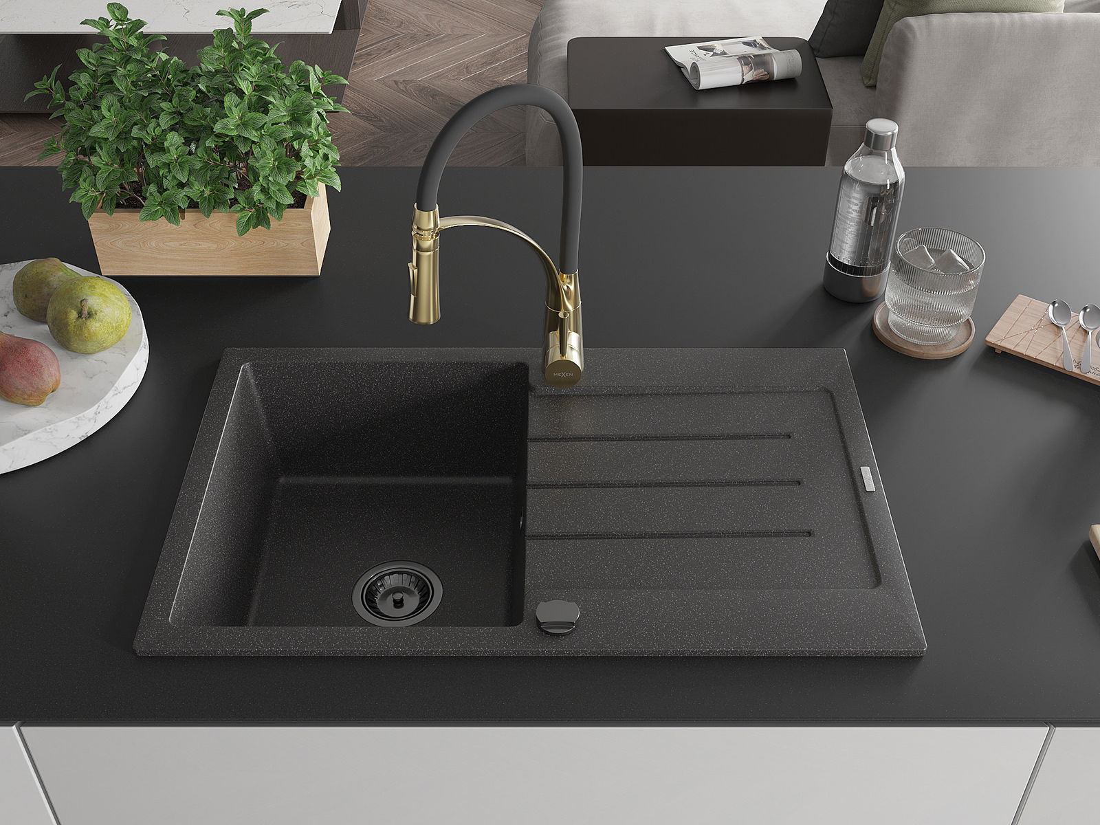 Mexen Bruno granitový drez 1-komorový s odkvapkávačom a kuchynskou batériou Aster, čierny s fľakmi - 6513-76-73450-57-B