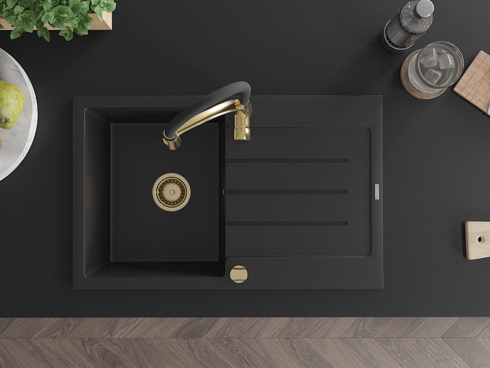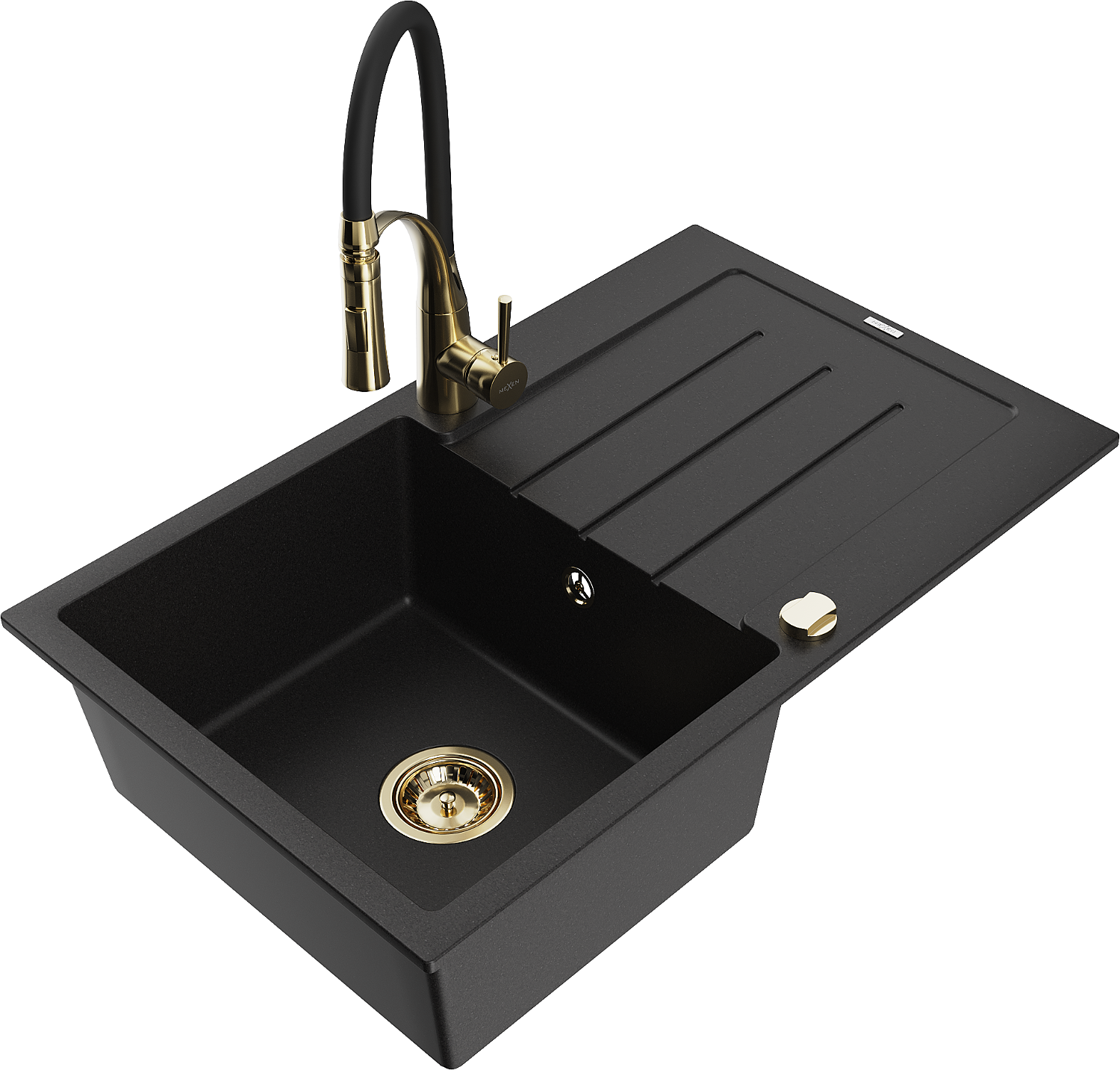 Mexen Bruno granitový kuchynský drez s 1 komorou a odkvapkávačom a kuchynskou batériou Aster, čierny - 6513-77-73450-57-G