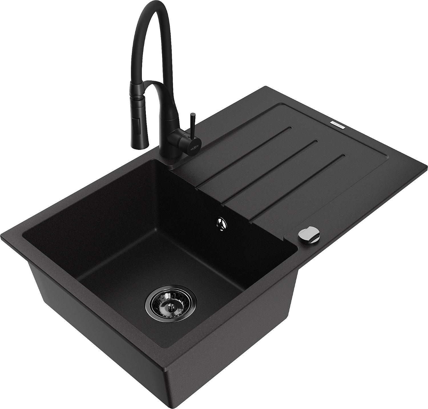 Mexen Bruno žulový kuchynský drez 1-komorový s odkvapkávačom a kuchynskou batériou Aster, čierny - 6513-77-73450-70-B