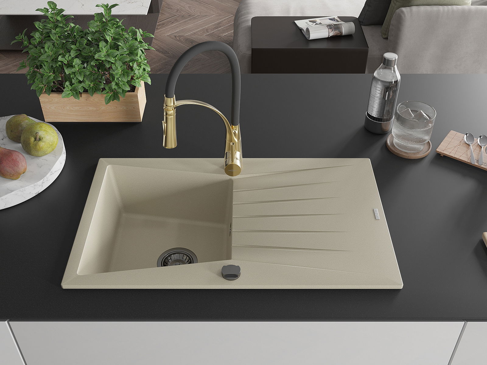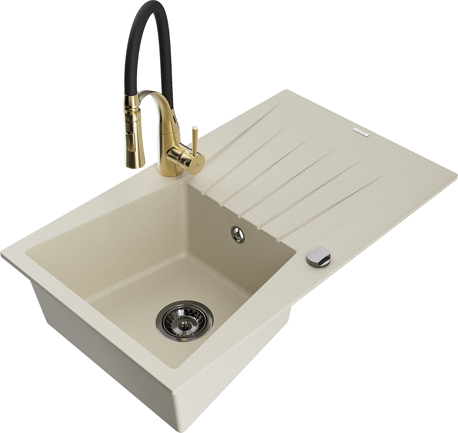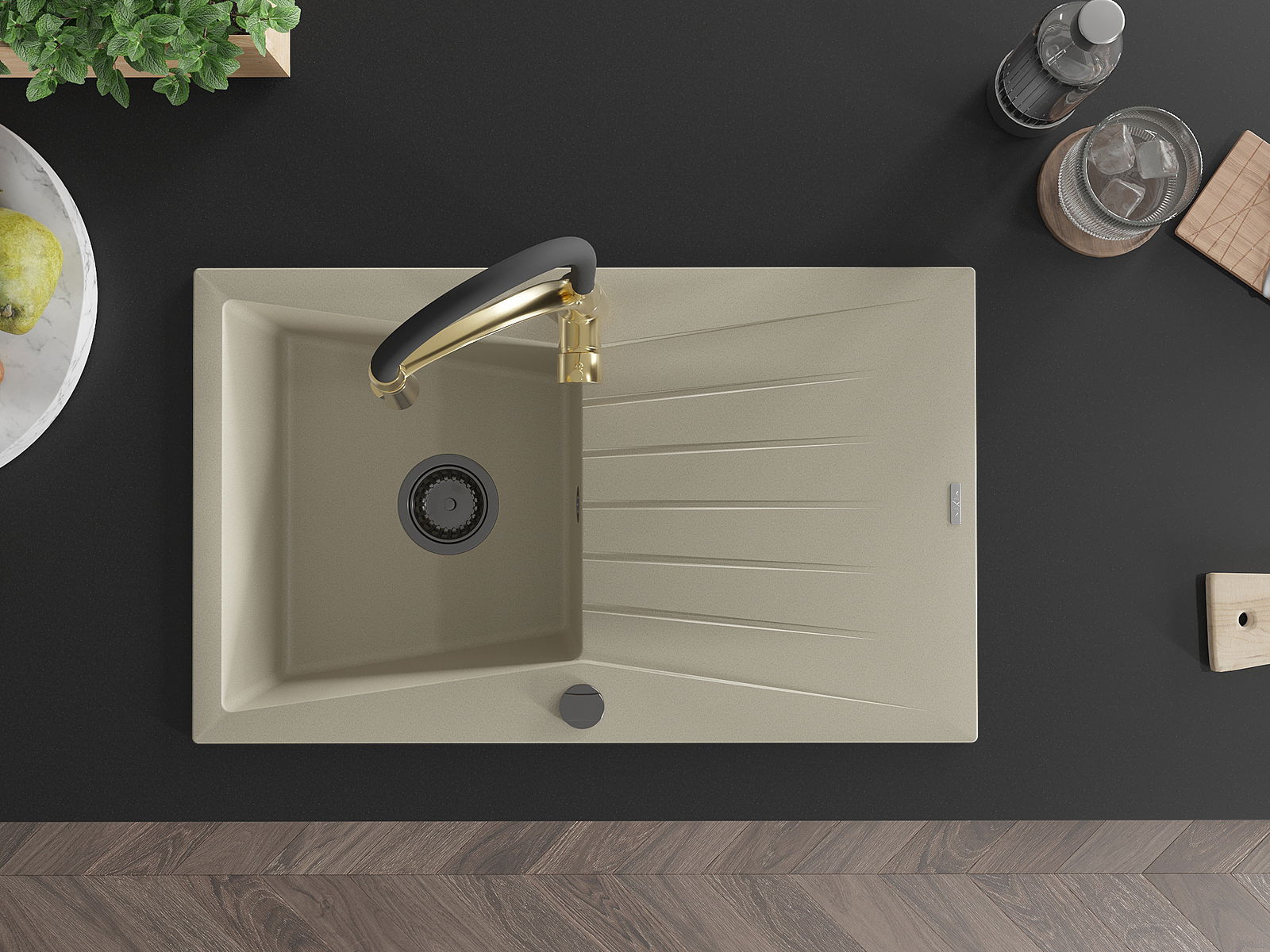 Mexen Cesar Granitový drez s 1 komorou, odkvapkávačom a kuchynskou batériou Aster, béžový - 6514-69-73450-57-B