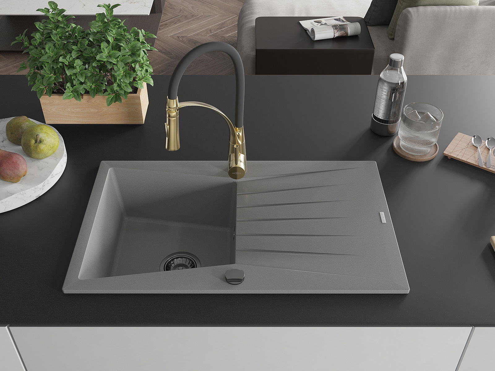 Mexen Cesar žulový kuchynský drez s 1 komorou, odkvapkávacou plochou a kuchynskou batériou Aster, sivý - 6514-71-73450-57-B