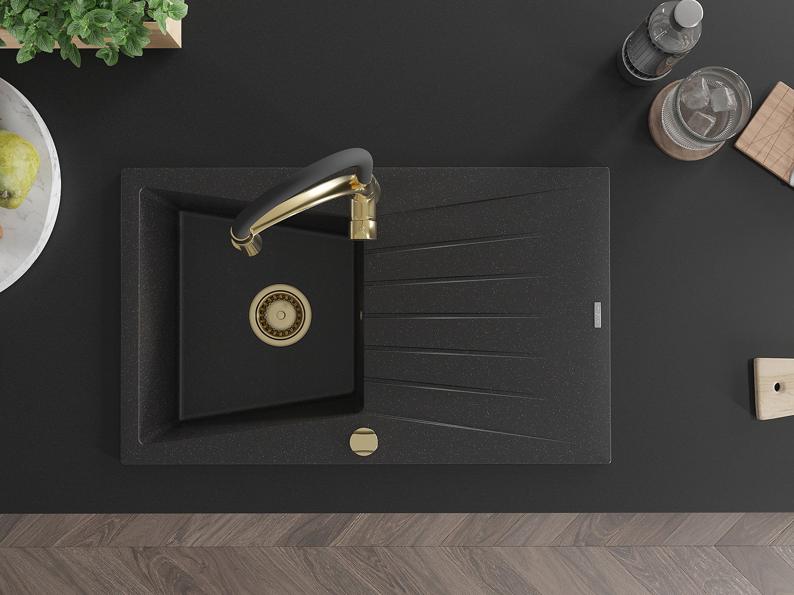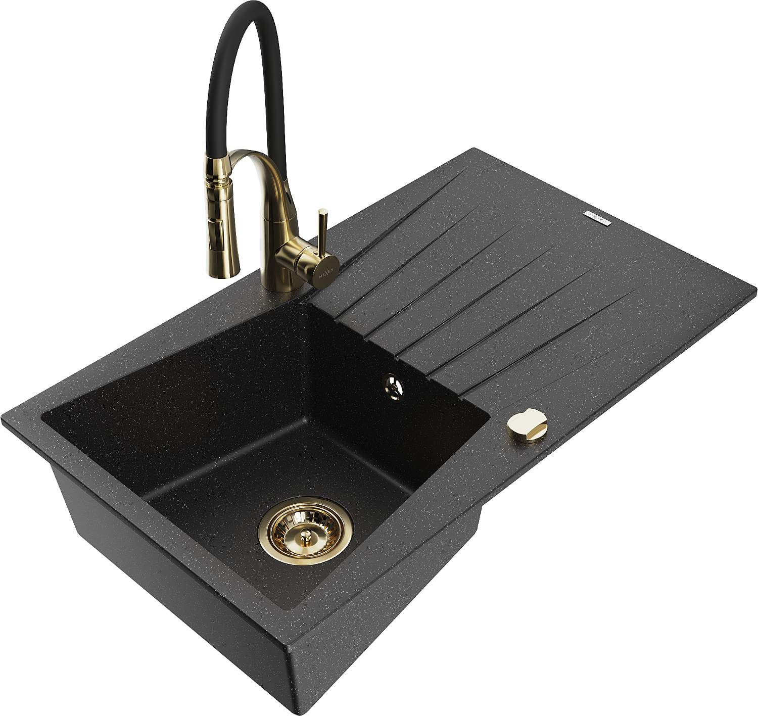 Mexen Cesar granitový drez s jednou komorou s odkvapkávačom a kuchynskou batériou Aster, čierny/strieborný metalický