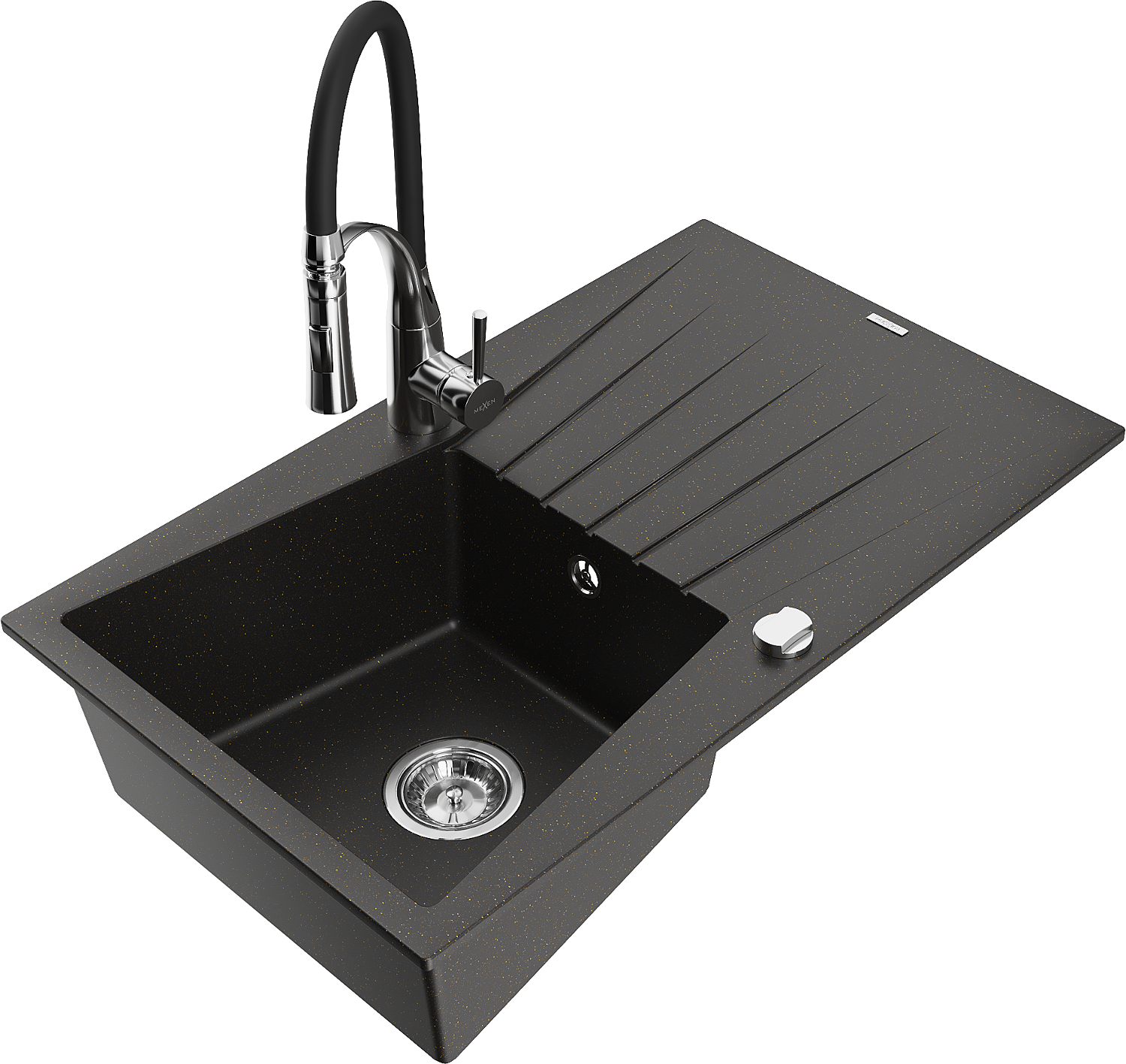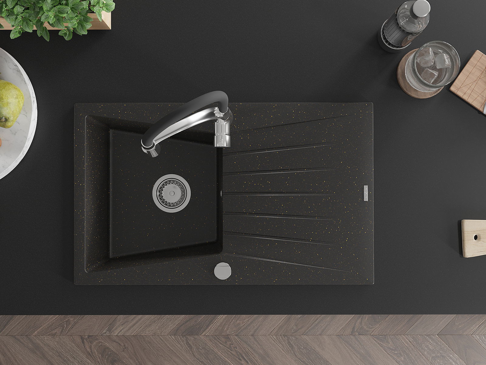 Mexen Cesar žulový drez s 1-komorou s odkvapávačom a kuchynskou batériou Aster, čierna/zlatý metalický - 6514-75-73450-07