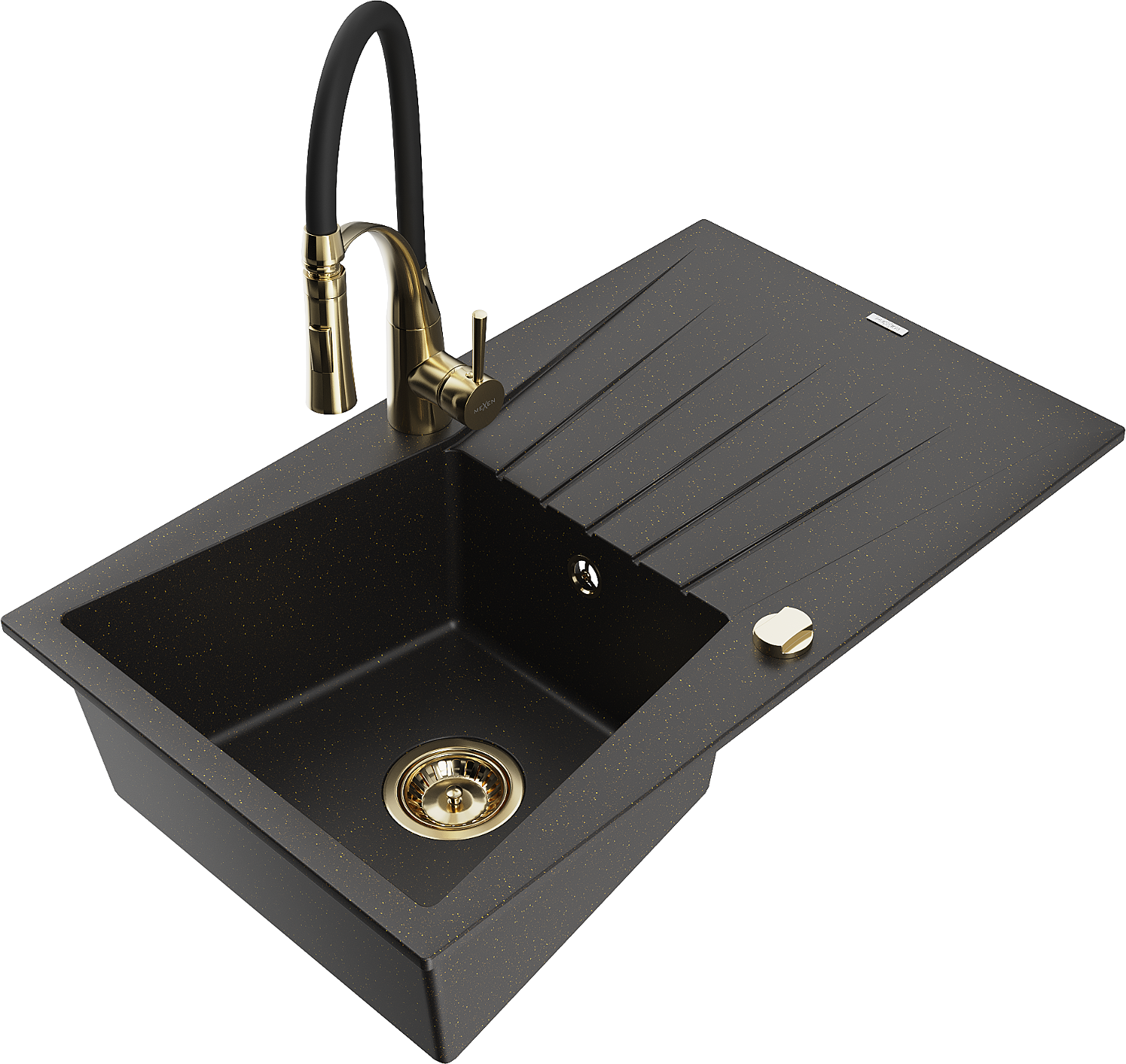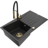 Mexen Cesar žulový drez s 1-komorou a odkvapkávačom a kuchynskou batériou Aster, čierny/zlatý metalik - 6514-75-73450-57-G