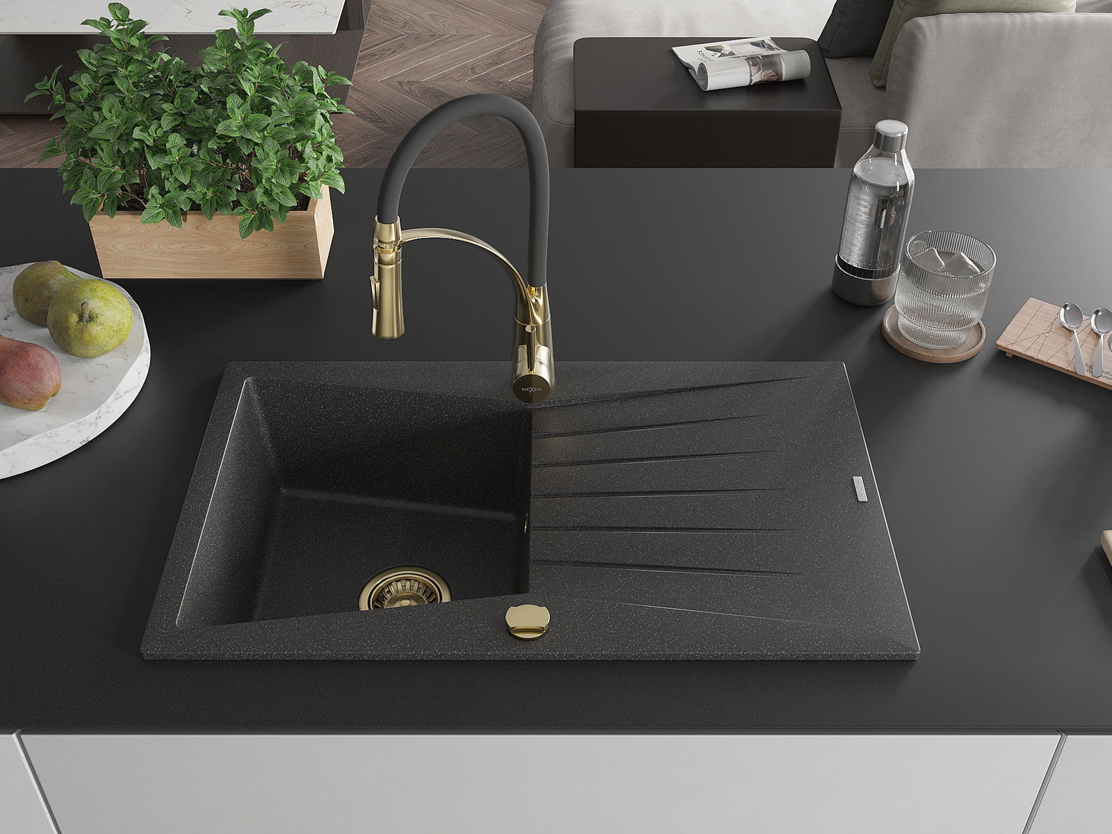 Mexen Cesar žulový drez 1-komorový s odkvapkávačom a kuchynskou batériou Aster, čierny škvrnitý - 6514-76-73450-57-G