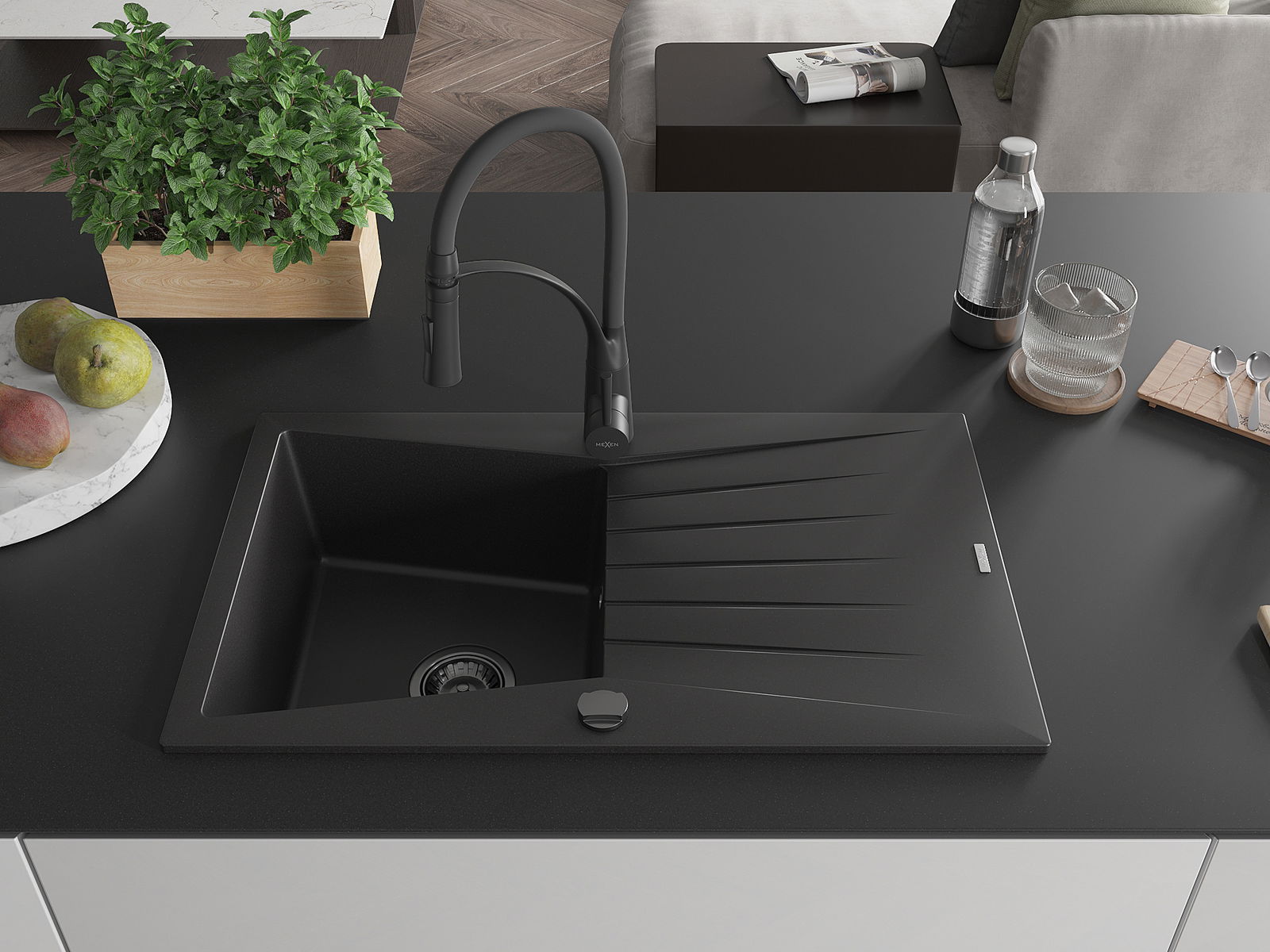 Mexen Cesar jednovaničkový granitový drez s odkvapkávačom a kuchynskou batériou Aster, čierny - 6514-77-73450-70-B