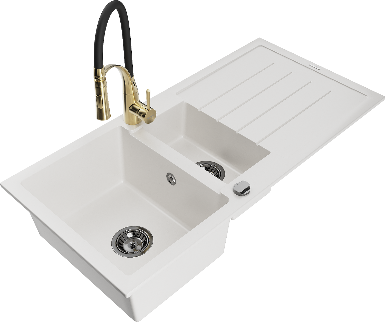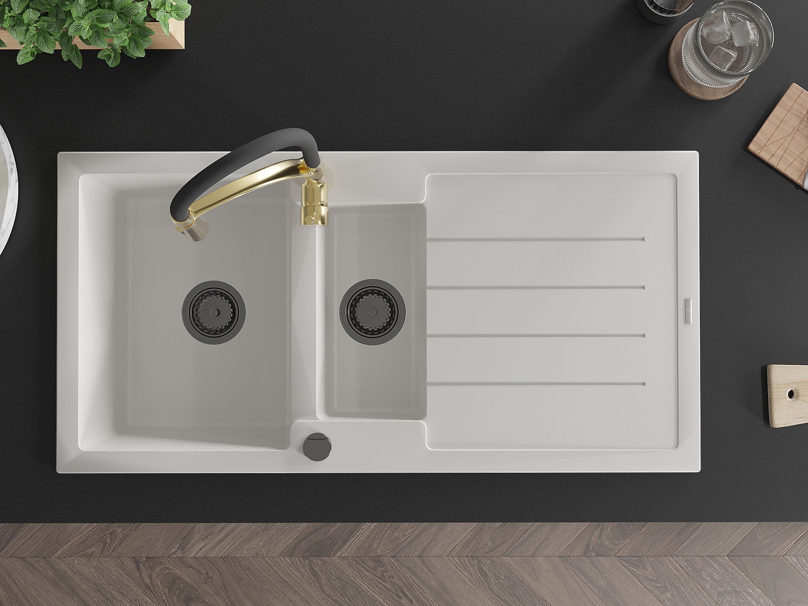 Mexen Andres žulový drez 1,5-komorový s odkvapkávačom a kuchynská batéria Aster, biela - 6515-20-73450-57-B