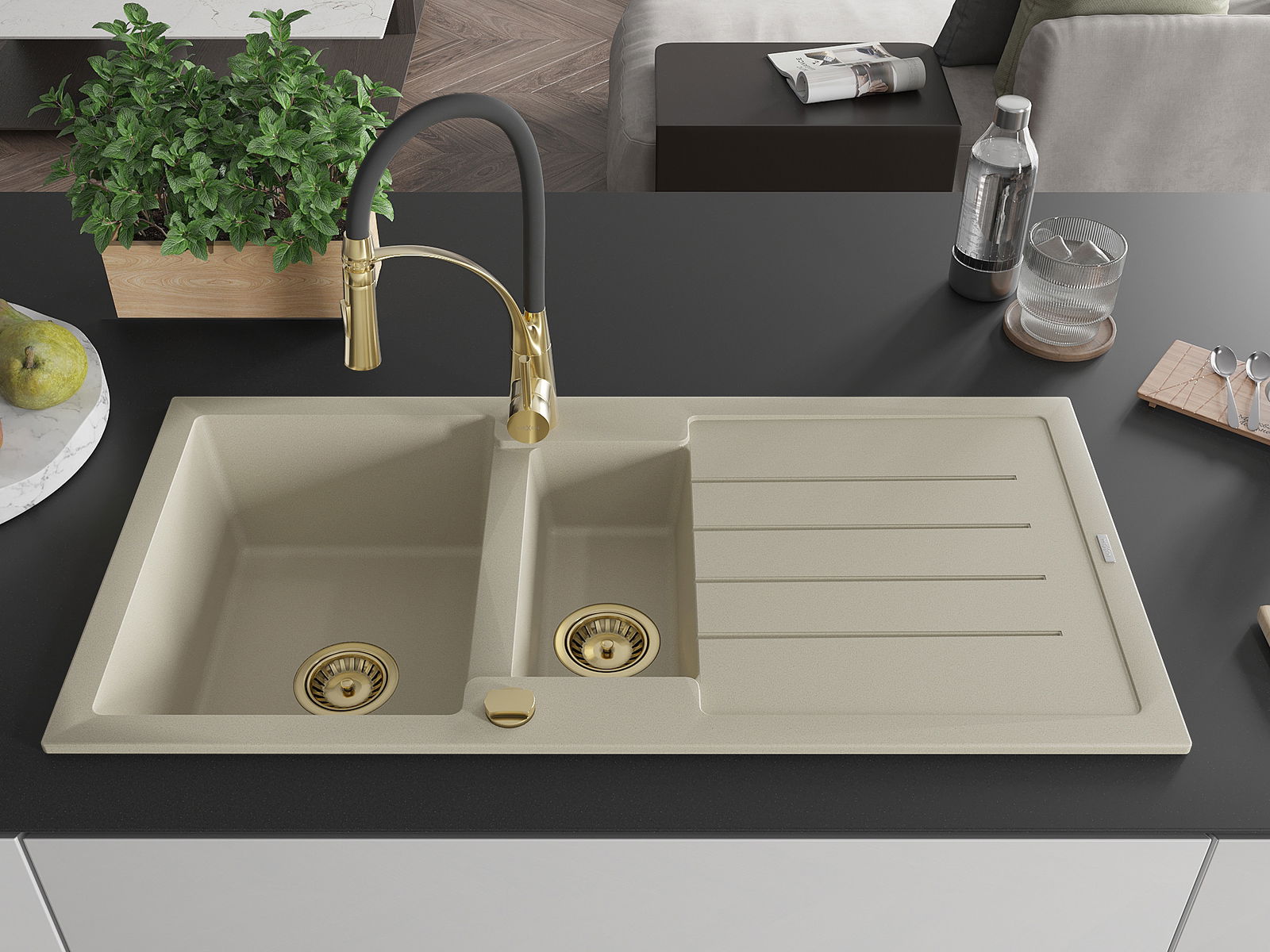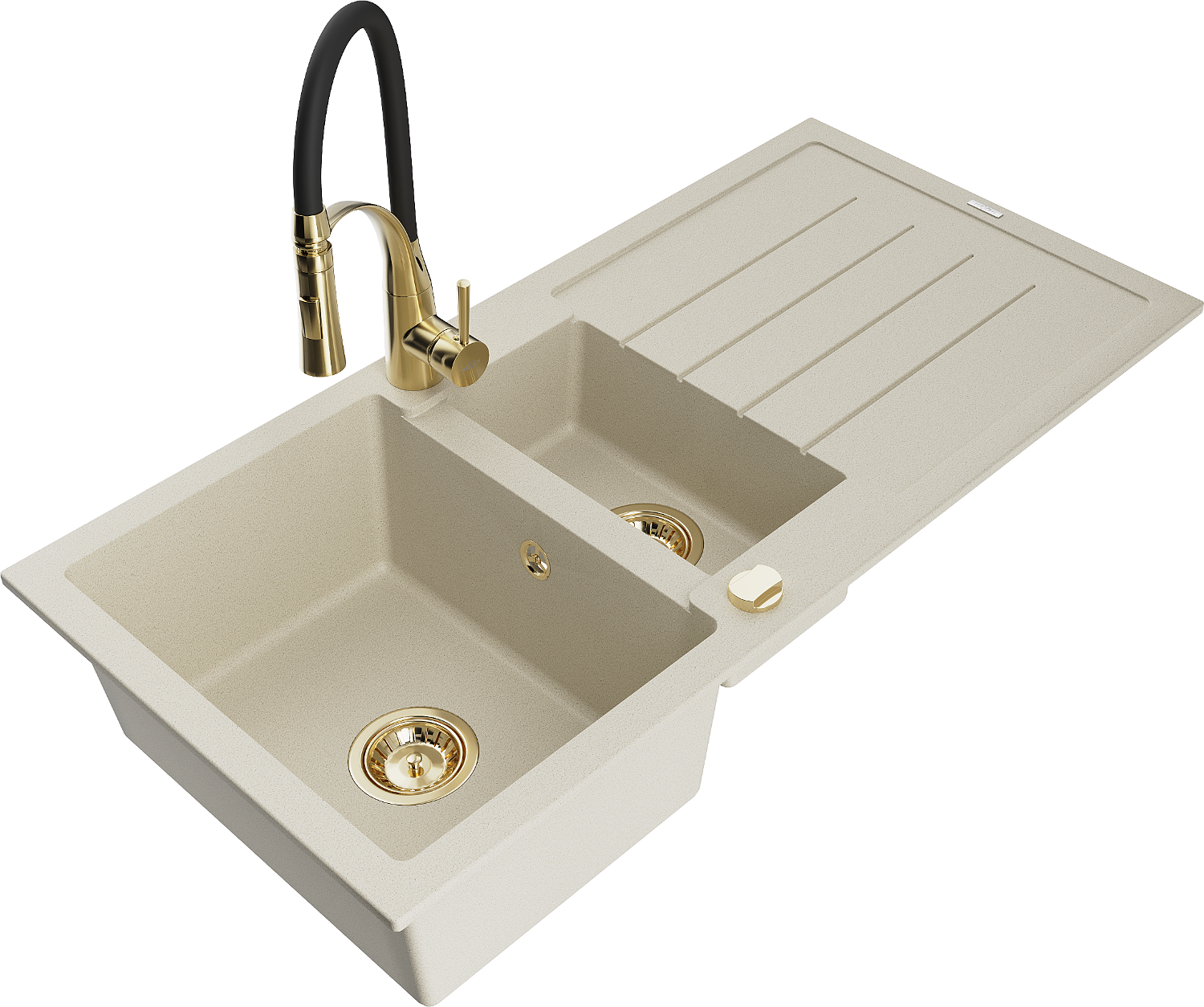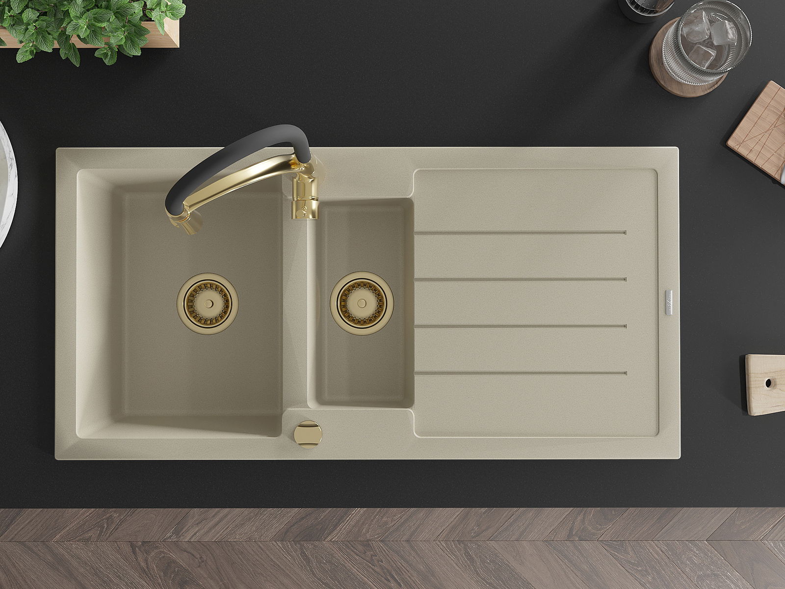 Mexen Andres granitový drez 1,5-komorový s odkvapkávačom a kuchynskou batériou Aster, béžový - 6515-69-73450-57-G