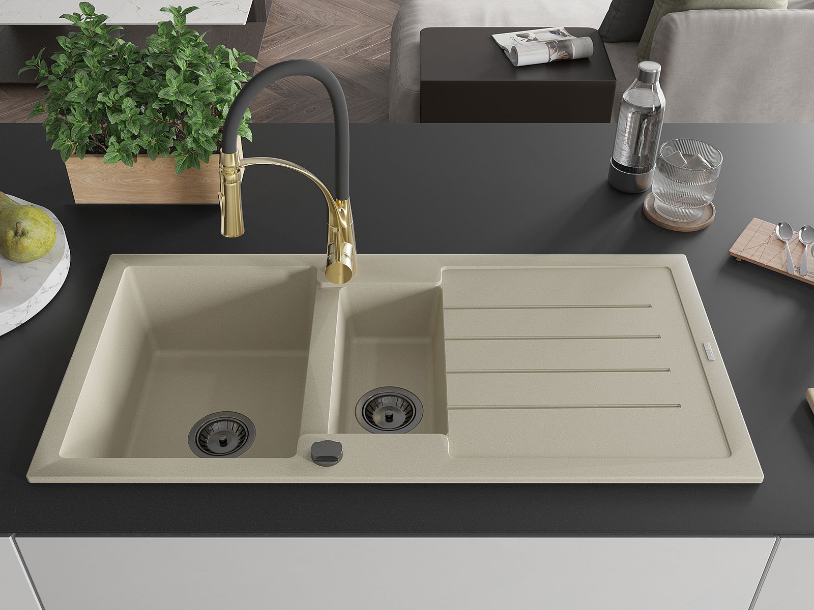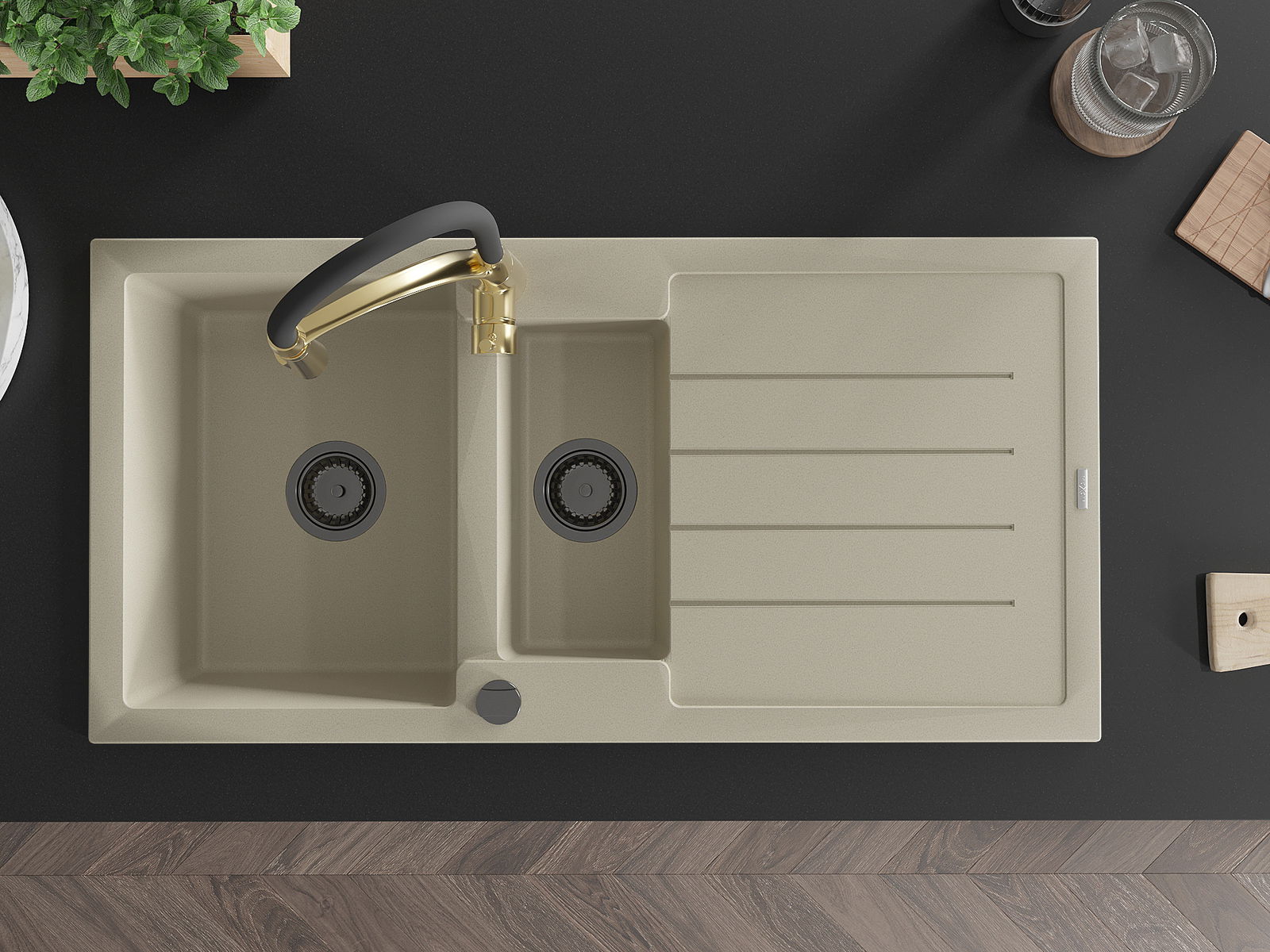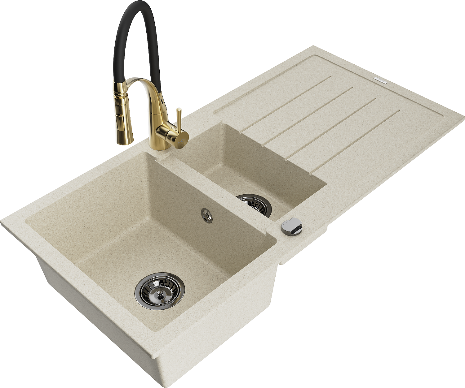 Mexen Andres žulový drez 1,5-komorový s odkvapkávačom a kuchynskou batériou Aster, béžový - 6515-69-73450-57-B