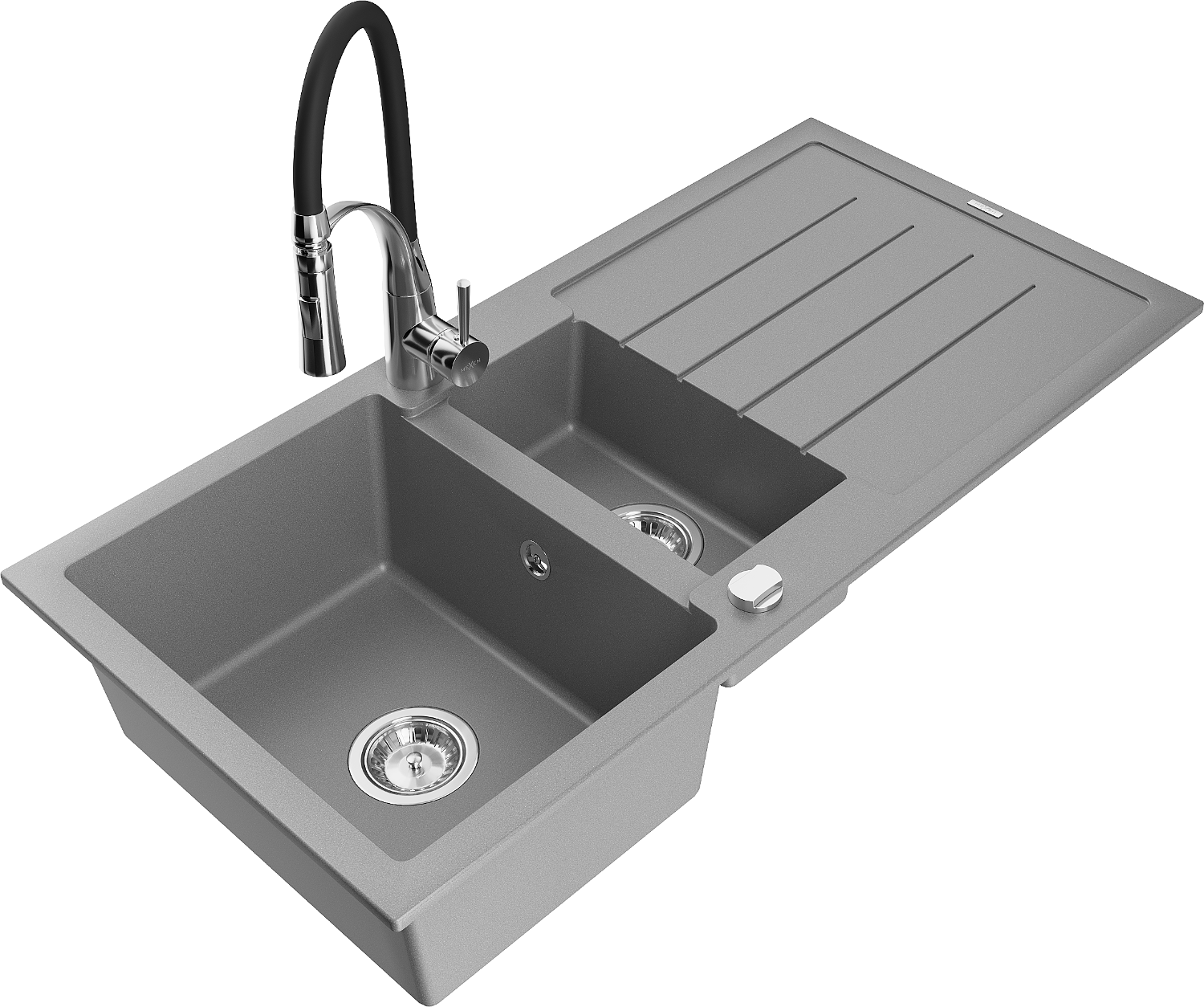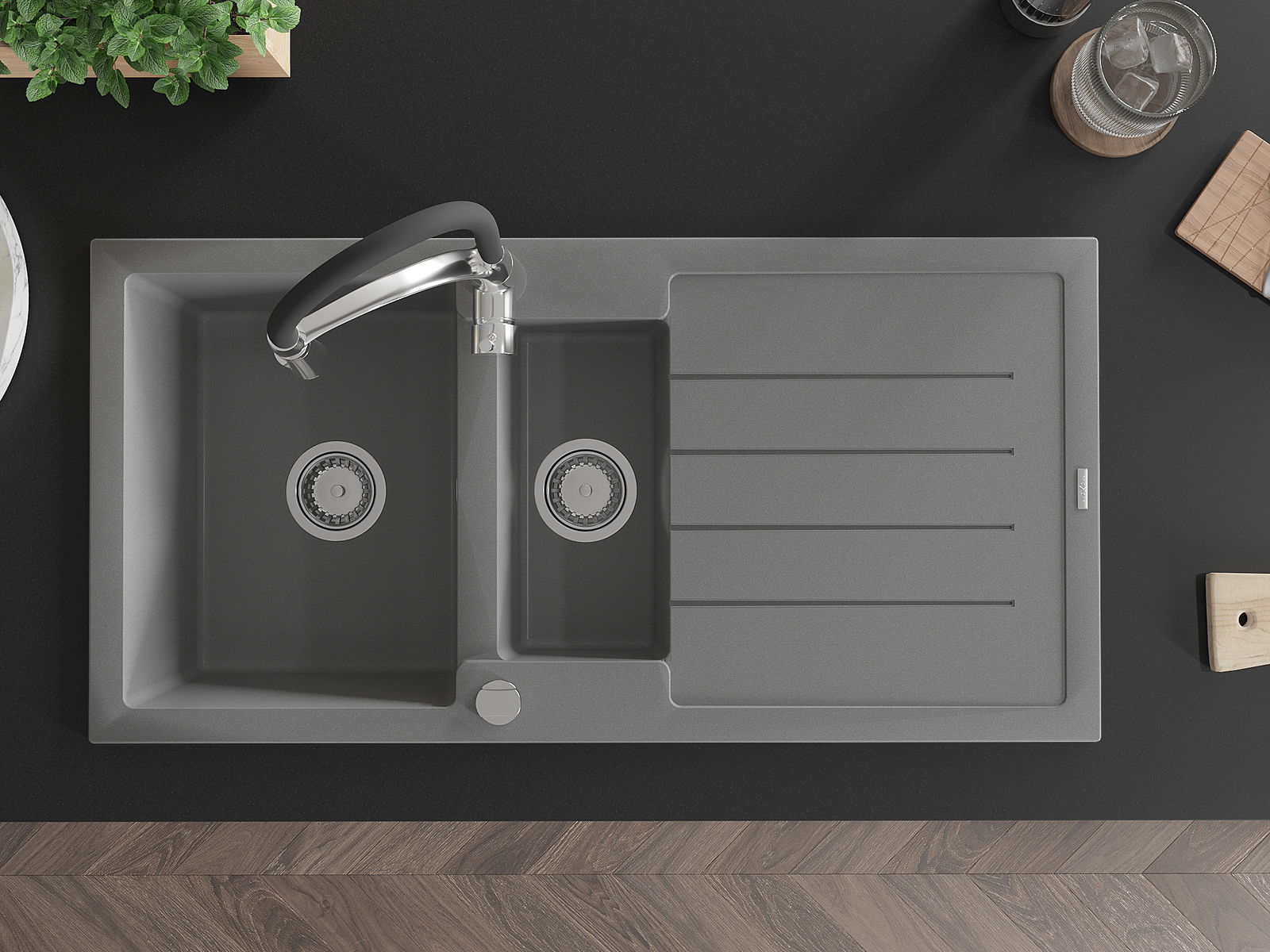 Mexen Andres žulový drez 1,5-komorový s odkvapkávačom a kuchynská batéria Aster, sivá - 6515-71-73450-07