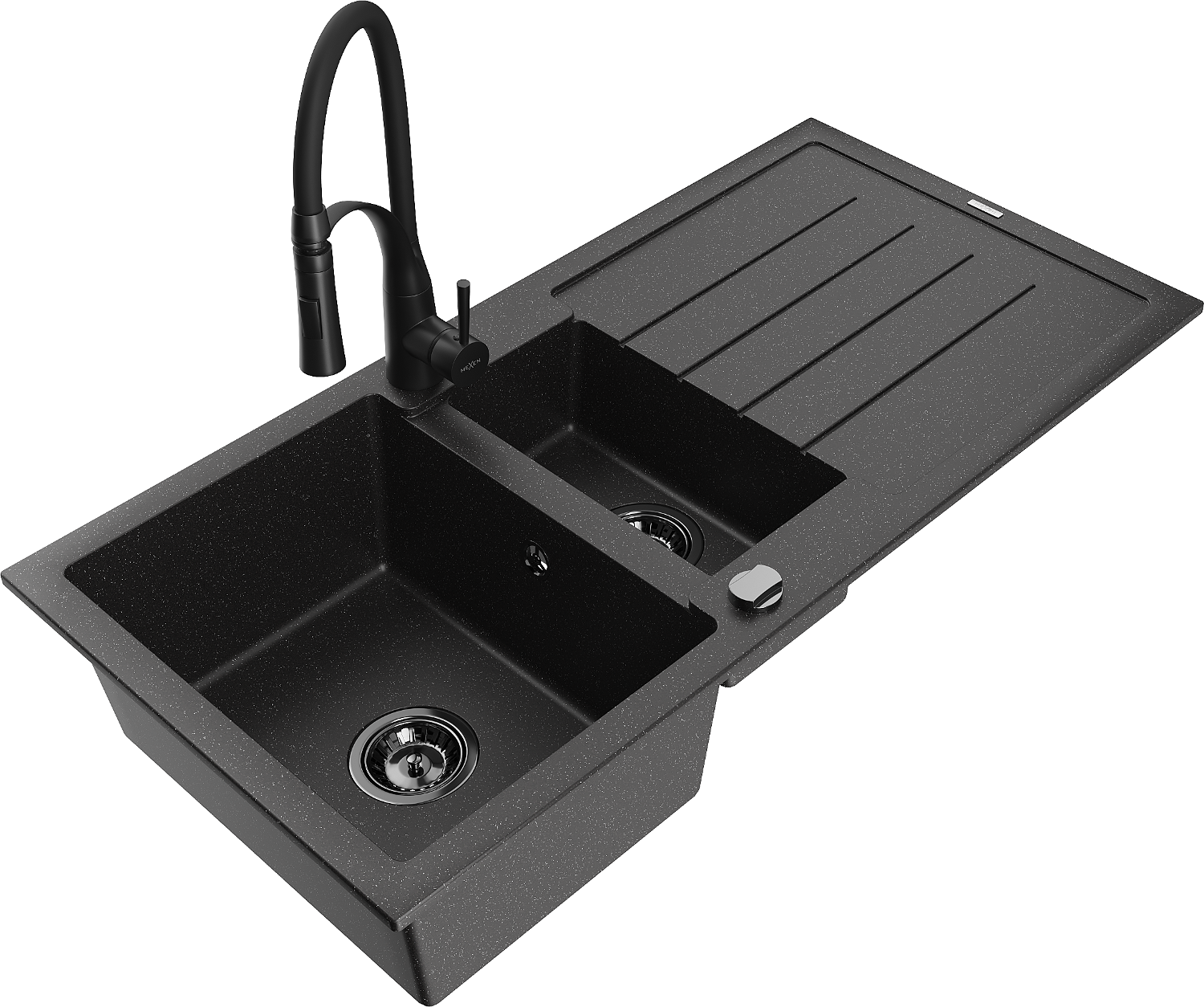 Mexen Andres granitový drez 1,5-komorový s odkvapkávacou plochou a kuchynskou batériou Aster, čierny/strieborný - 6515-73-73450?