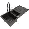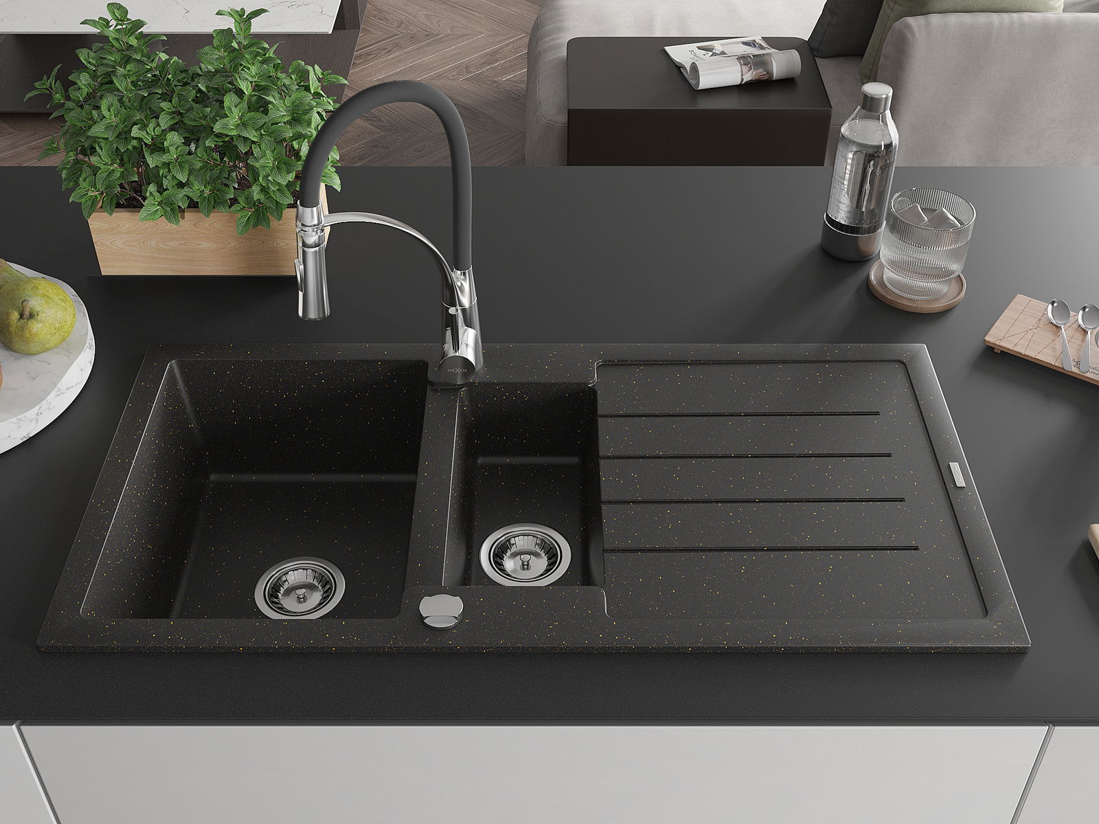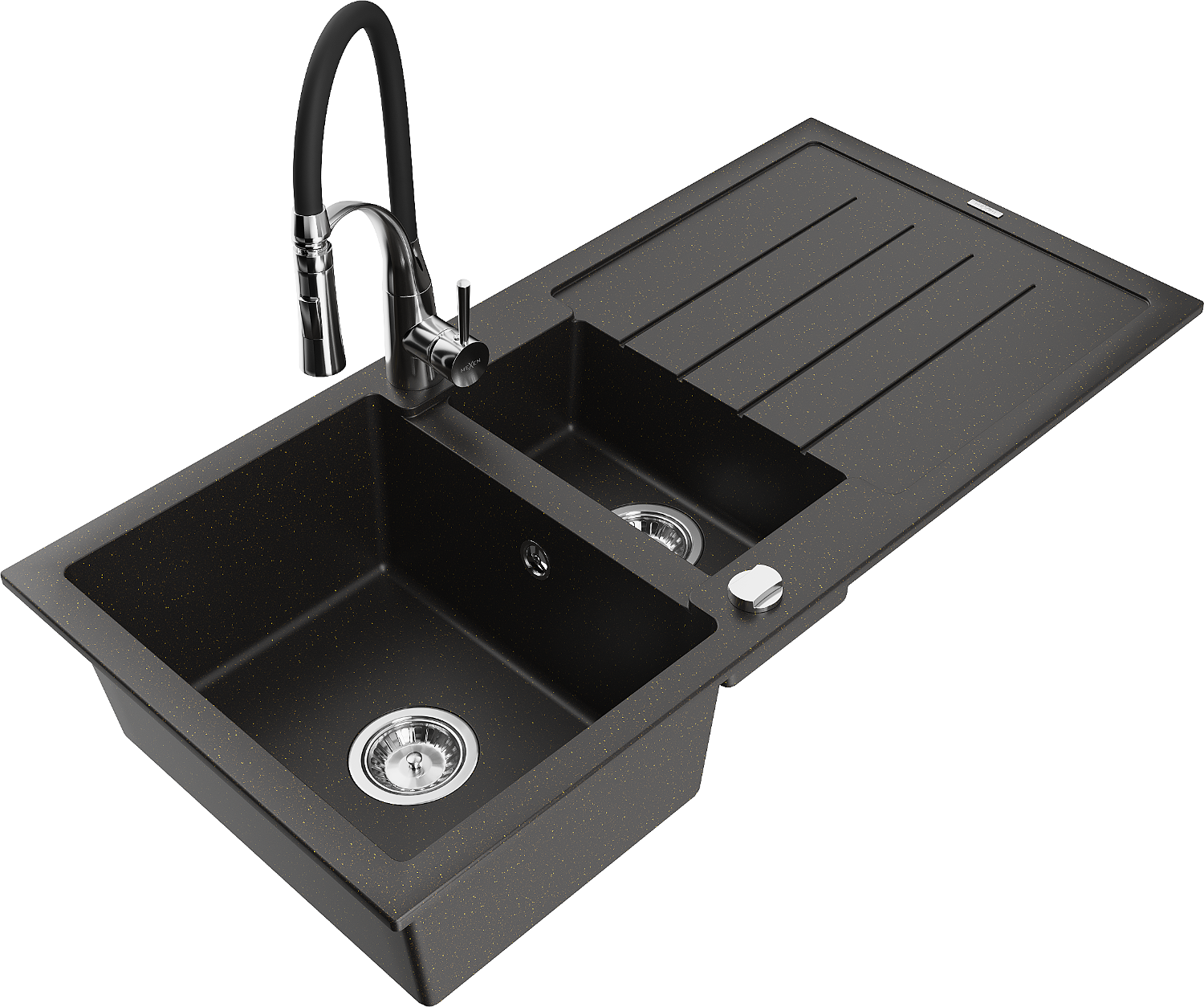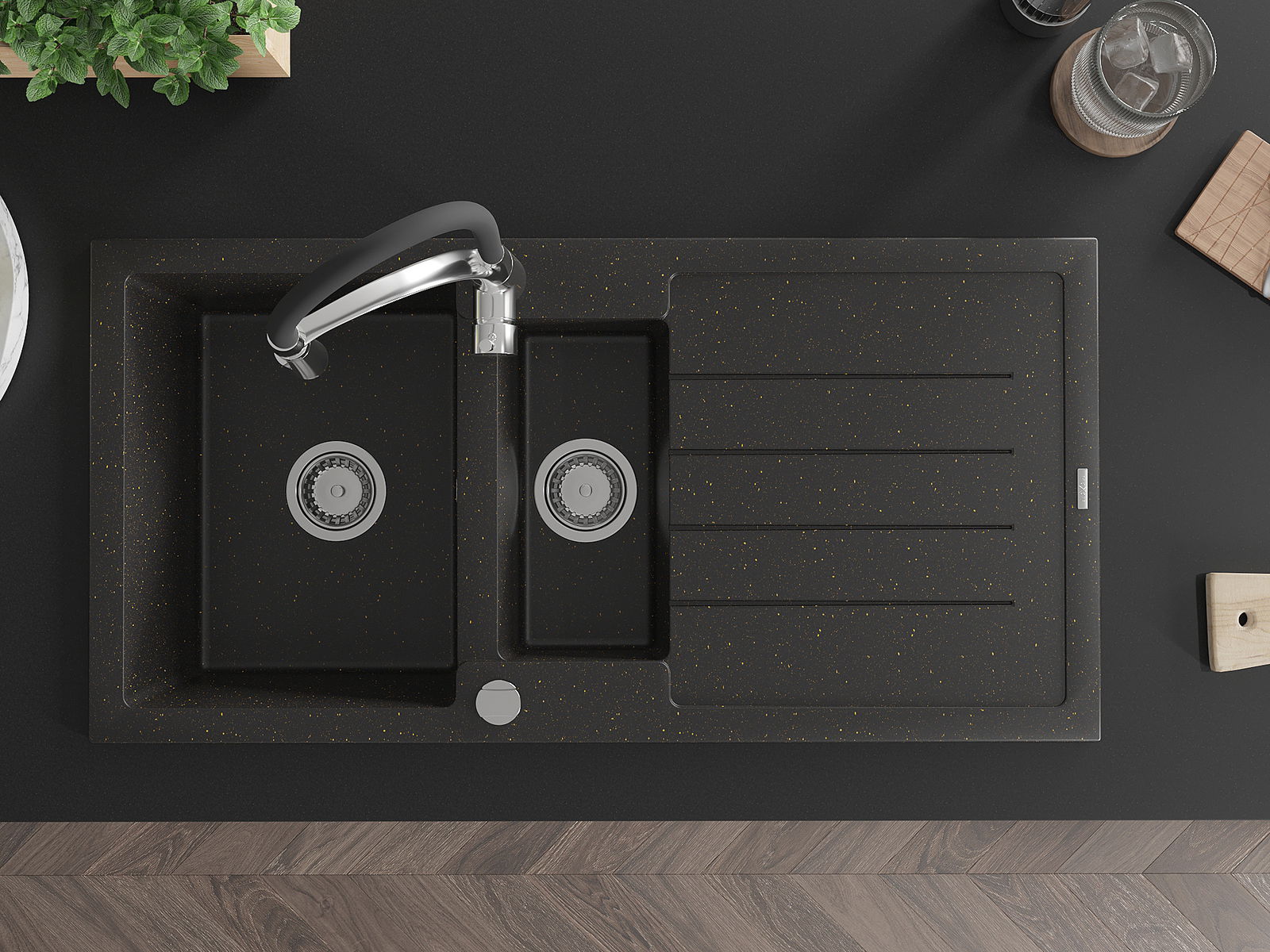 Mexen Andres granitový drez 1,5-komorový s odkvapkávačom a kuchynskou batériou Aster, čierny/zlatý metalický - 6515-75-73450-07
