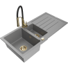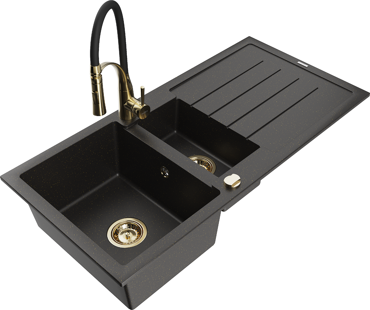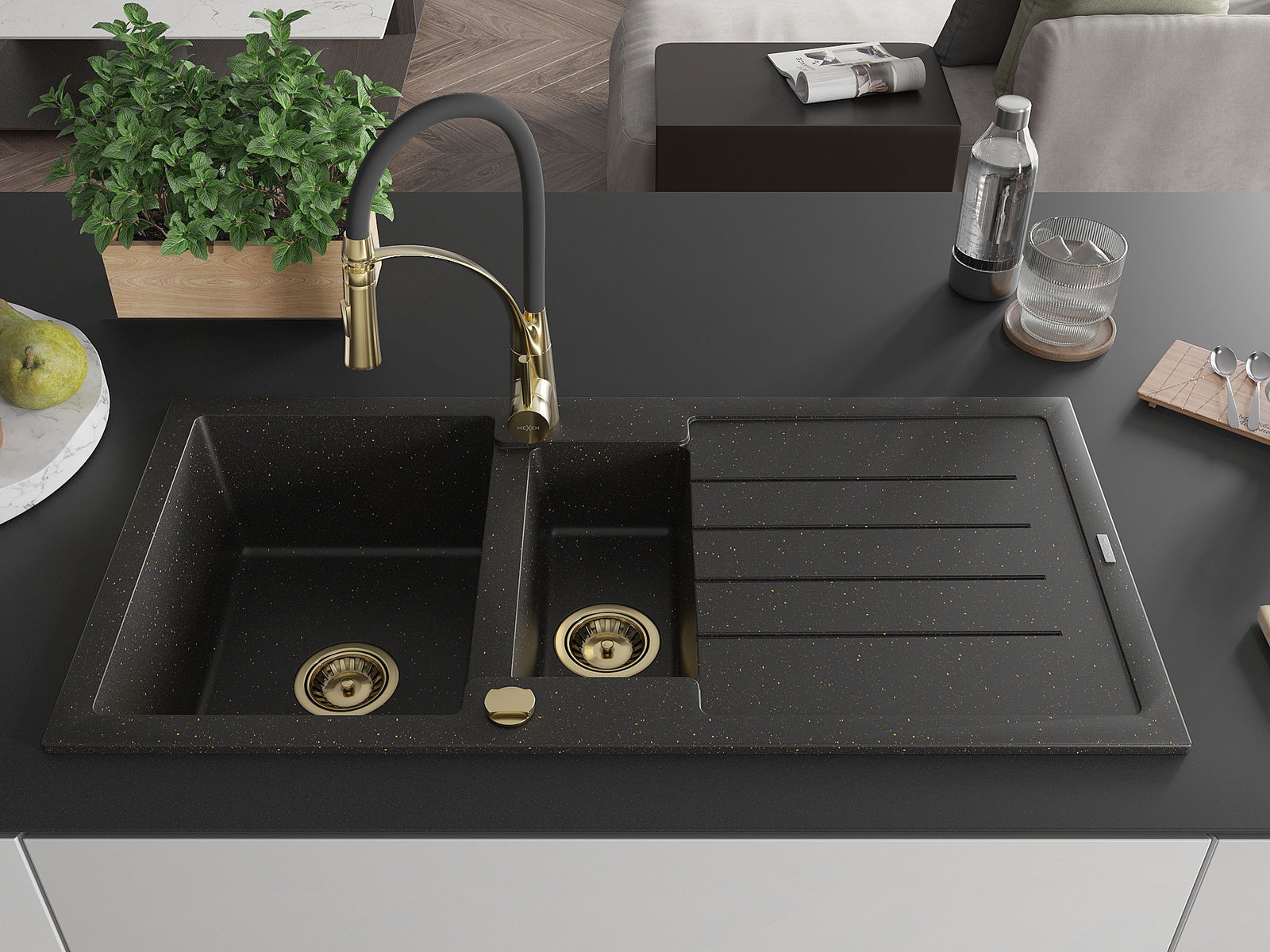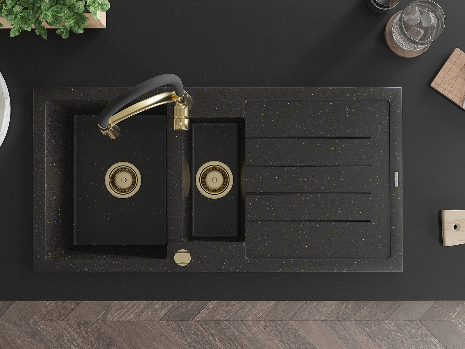 Mexen Andres granitový drez s odkvapkávačom 1,5-komorový a kuchynskou batériou Aster, čierny/zlatý metalický