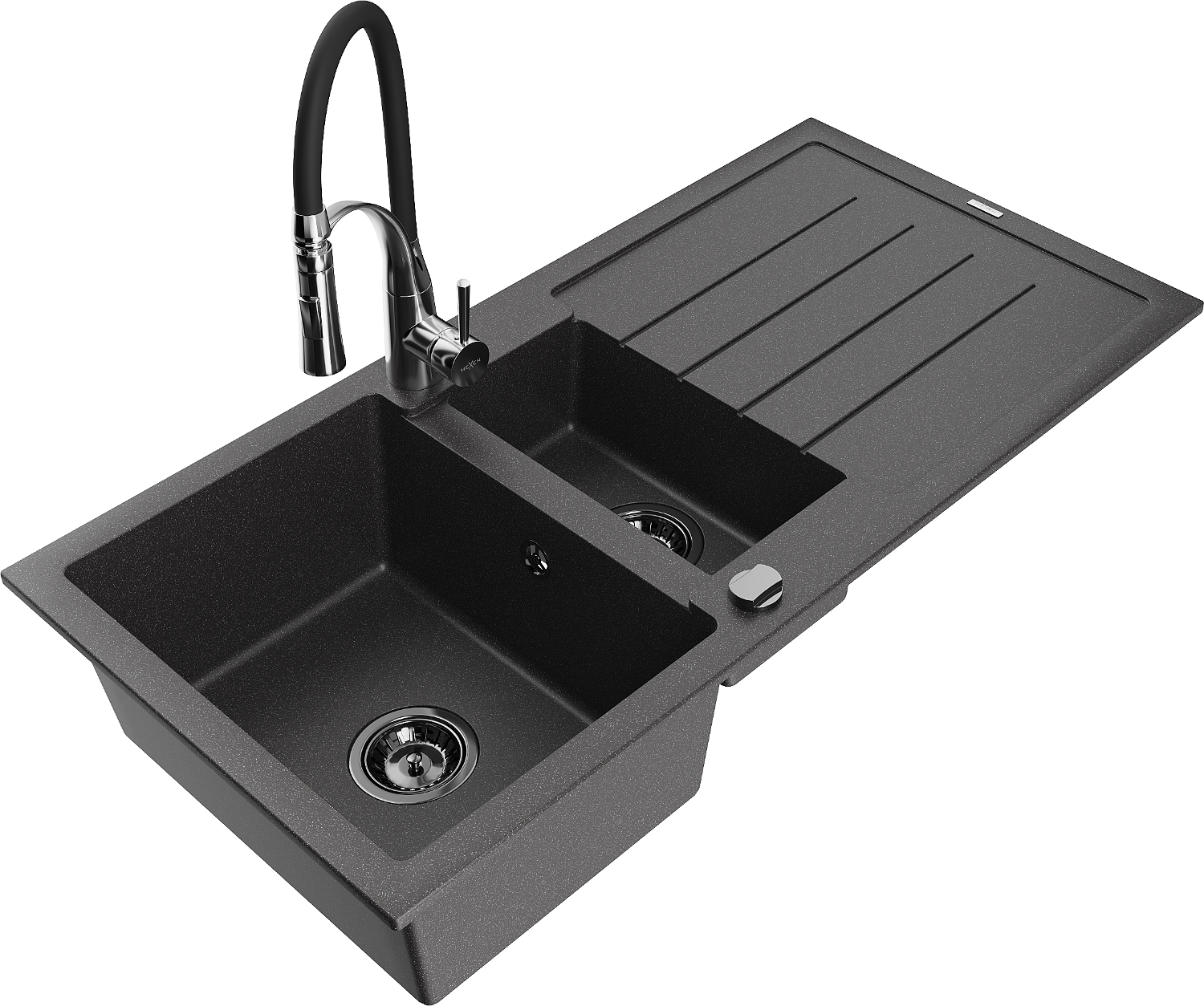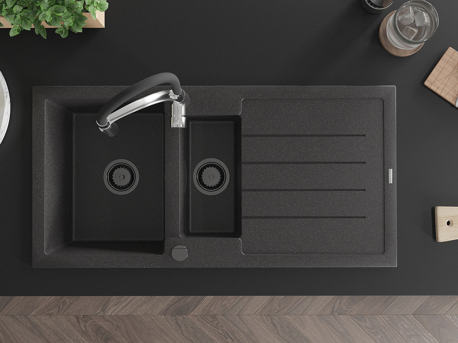 Mexen Andres žulový drez 1,5-komorový s odkvapkávačom a kuchynskou batériou Aster, čierny štipľavý - 6515-76-73450-07-B