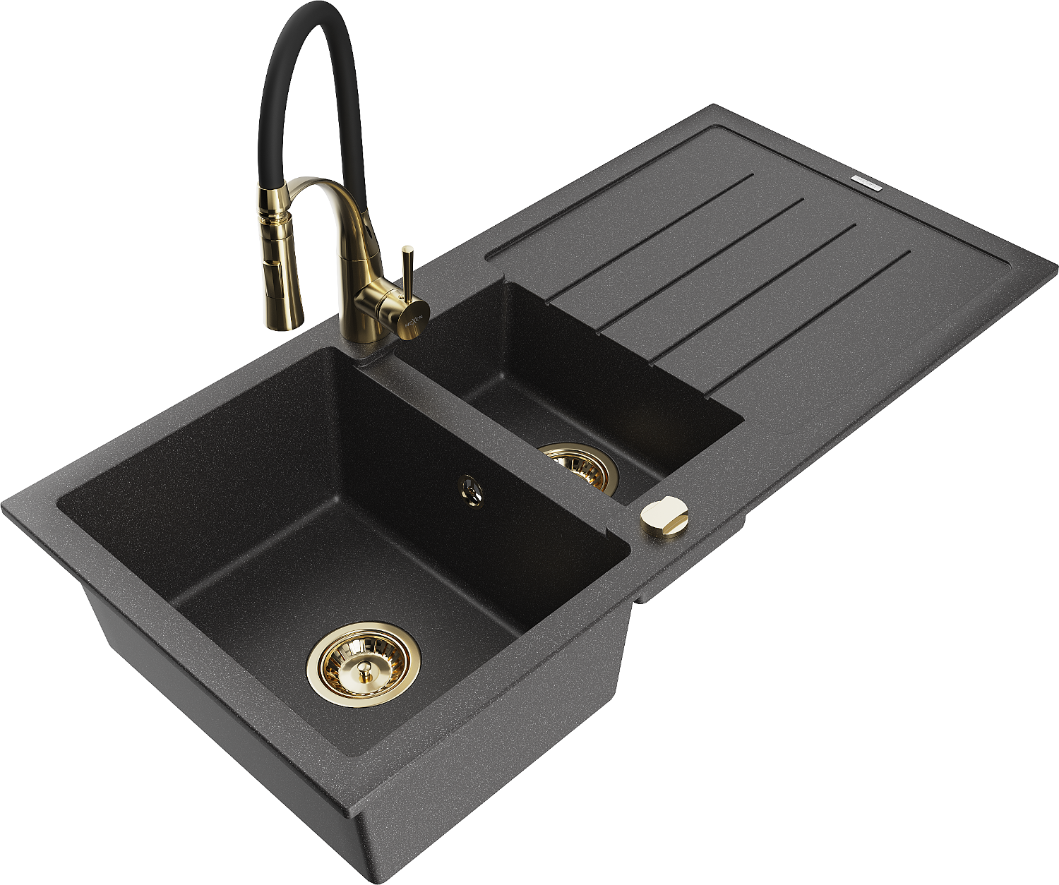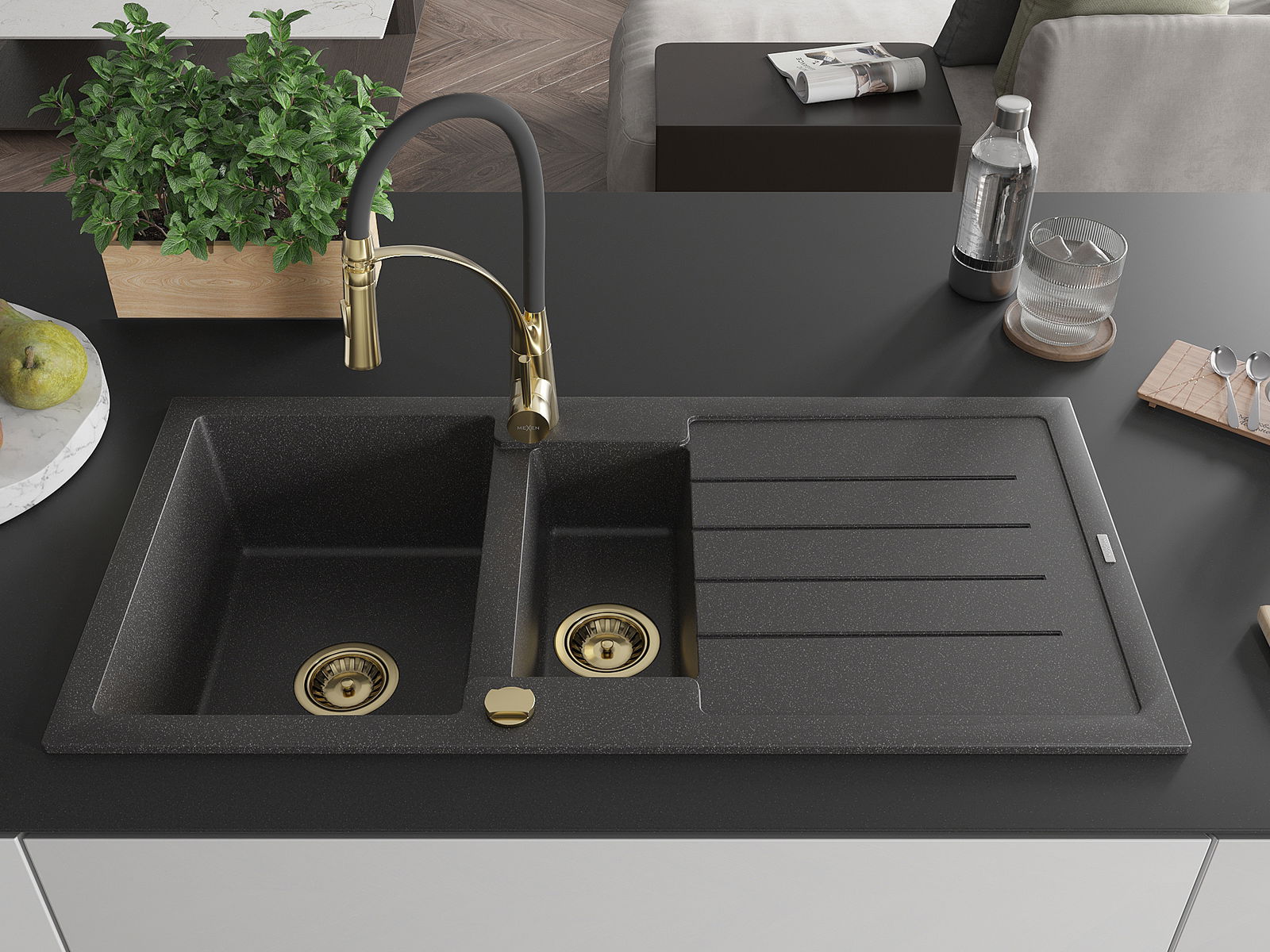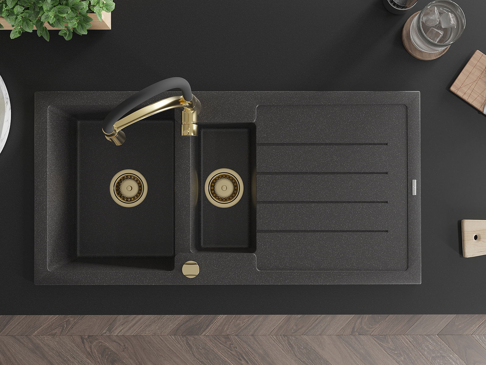 Mexen Andres žulový drez 1,5-komorový s odkvapkávačom a kuchynskou batériou Aster, čierny bodkovaný - 6515-76-73450-57-G