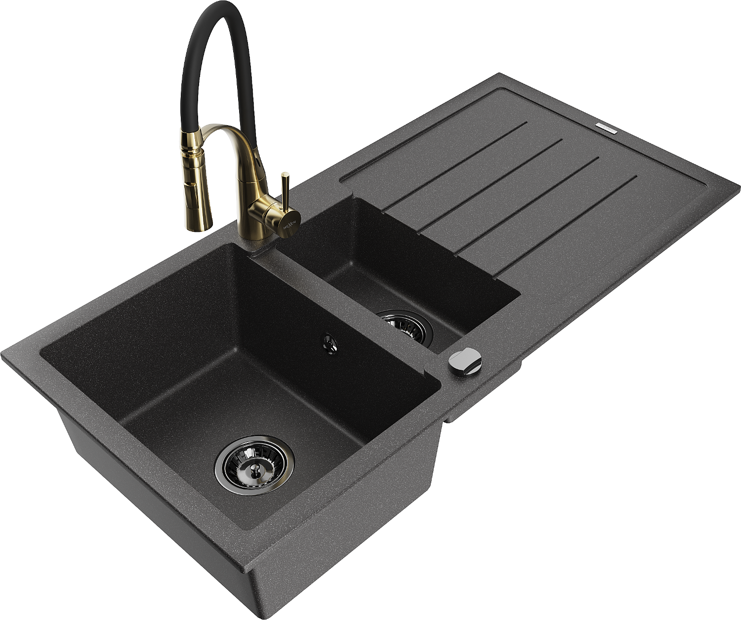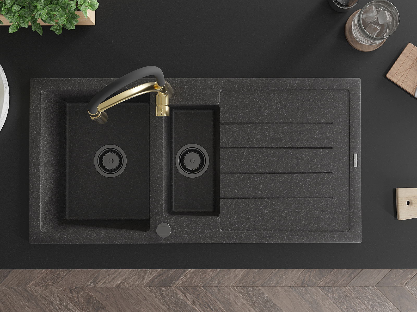 Mexen Andres granitový drez 1,5-komorový s odkvapkávačom a kuchynskou batériou Aster, čierny škvrnitý - 6515-76-73450-57-B